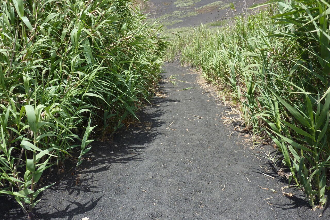 Nach einer kleinen Anhöhe zweigt bei einem halbhohen Wegweiser der Inselregierung (02) (361 m) rechts ein Weg an einem weißen Haus mit grauer Tür ab. Der Weg geht nun steil bergauf und das weiche Lavagranulat erschwert das Gehen. Nach 340 m endet der Weg und wir gehen rechts für weitere 500 m, bis wir zu einem vereinzelt stehenden Haus auf der linken Straßenseite kommen. Hier verlassen wir den Hauptweg hinter uns und gehen rechts in südliche Richtung. Bereits nach 50 m nehmen wir den Abzweiger nach rechts und gehen an einem verlassenen Haus vorbei. Der Weg führt uns nun in Richtung vereinzelt stehender Palmen, die etwas erhöht im vor uns liegenden Hang stehen.
