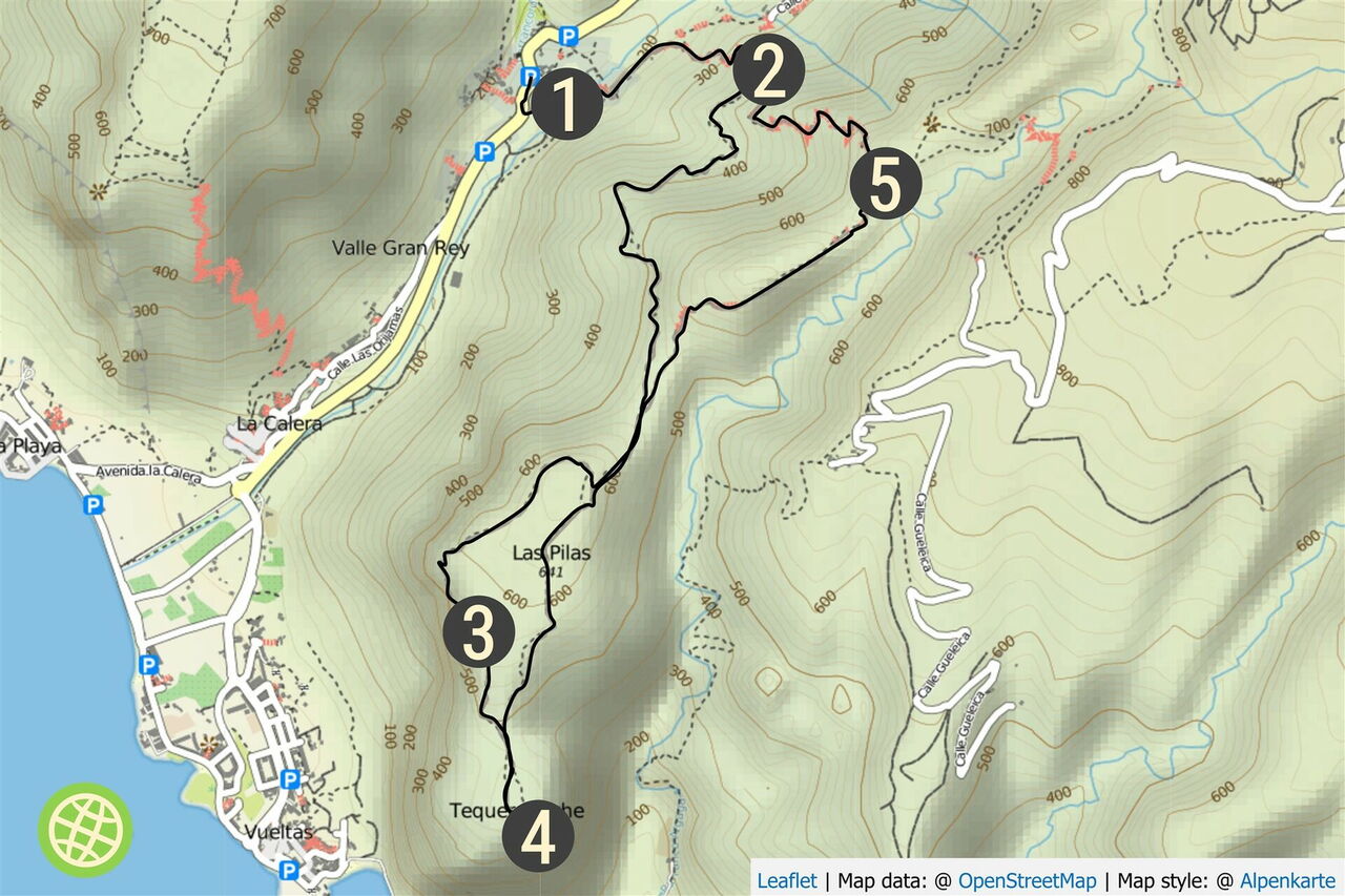 Unsere Wanderung beginnt in El Guro im oberen Valle Gran Rey. So gemütlich, wie die Tour startet, so sportlich wird sie auf dem Lechepfad - einem alten Verbindungsweg zu den Häusern und Feldern auf der Las-Pilas-Hochebene. Gegenüber der konventionellen Route sparte der Bauer auf dieser Route 600 m Entfernung und 110 Höhenmeter. Dafür wird aber die Wanderung zu einem Drahtseilakt oberhalb des Valle Gran Ray. Für unsere Mühen werden wir mit einem herrlichen Panoramaweg und einer grandiosen Aussicht auf den 500 m tiefer liegenden Küstenstreifen des Südteils der Insel belohnt. Bei guter Sicht kann man auch noch die vorgelagerten Inseln El Hierro und im Nordosten Las Palmas ausmachen.
