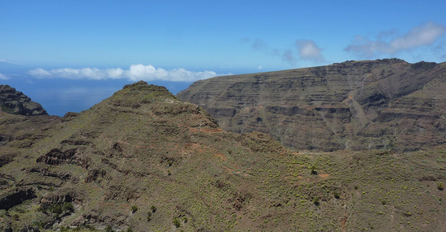 Der Einstieg zum Lechepfad ist nicht einfach zu finden. Nach 500 m stehen wir unterhalb eines großen Felsvorsprungs, der nachfolgende Weg führt in engen Kehren bergauf. Wir treffen auf ein weiß-rotes Kreuz auf einem Stein und einige Meter weiter auf ein durchgestrichenes rot-weißes Kreuz, abgesperrt durch Steine. Hier zweigt rechts der (02) Lechepfad (379 m) ab. Da der Pfad schwer auszumachen ist, sind rote Punkte - aber nur auf dem ersten Drittel des Weges - eine essenzielle Orientierungshilfe. Vereinzelte Steinmännchen markieren zusätzlich den Pfad. Nach einer ockerbraunen Schichtwand überqueren wir einen Bergrücken und haben nun freien Blick auf das untere Valle Gran Ray, bis hin zur Nachbarinsel El Hierro. Auf dem nachfolgenden Stück queren wir eine riesige Erosionsrinne mit einigen grünen Tupfern; das sind Kiefern, die noch nicht in den Abgrund gerissen worden sind.