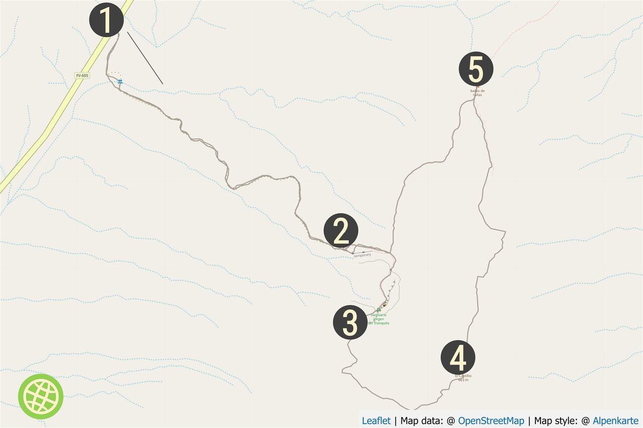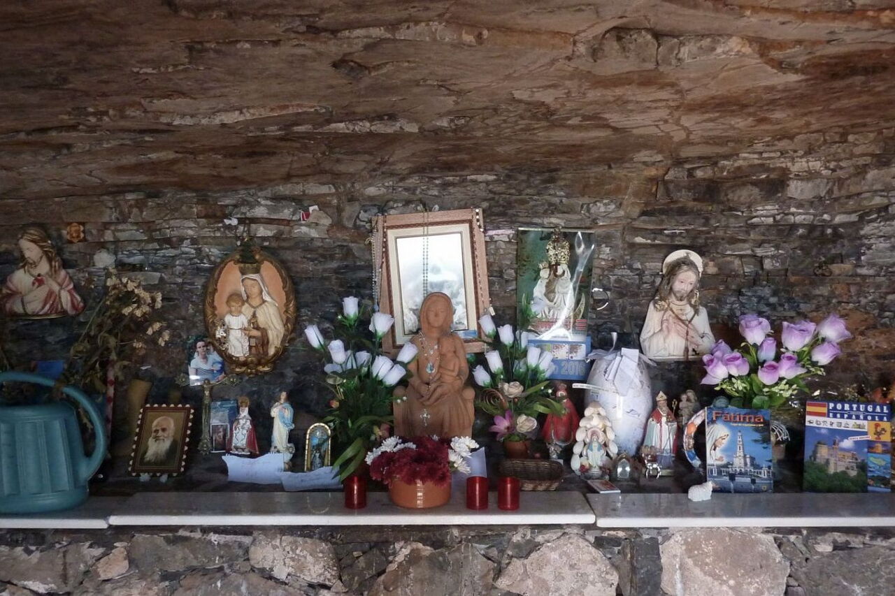 Dazu folgen wir der (02) Schotterpiste (404 m), die sich gemächlich bergauf schlängelt. Bei einem senkrecht stehenden Metallpfeiler endet die Piste und wir gehen auf dem links beginnenden Pfad auf einem Bergrücken, bis wir auf den ursprünglichen Hauptweg treffen. Diesem folgen wir rechts weiter bis zur Wallfahrtskirche, der Ermita de la Virgen de El Tanquito. Anfang des 20. Jahrhunderts wurde an dieser Stelle eine Quelle zur Wassergewinnung freigelegt. Als einige Bewohner des Ortes am Berg die Figur der Jungfrau de El Tanquito sahen, entstand die heutige Wallfahrtskirche. Nach der kleinen Erkundung geht es weiter auf dem Pfad, wir öffnen und schließen ein zweites, südlich gelegenes Ziegengatter.