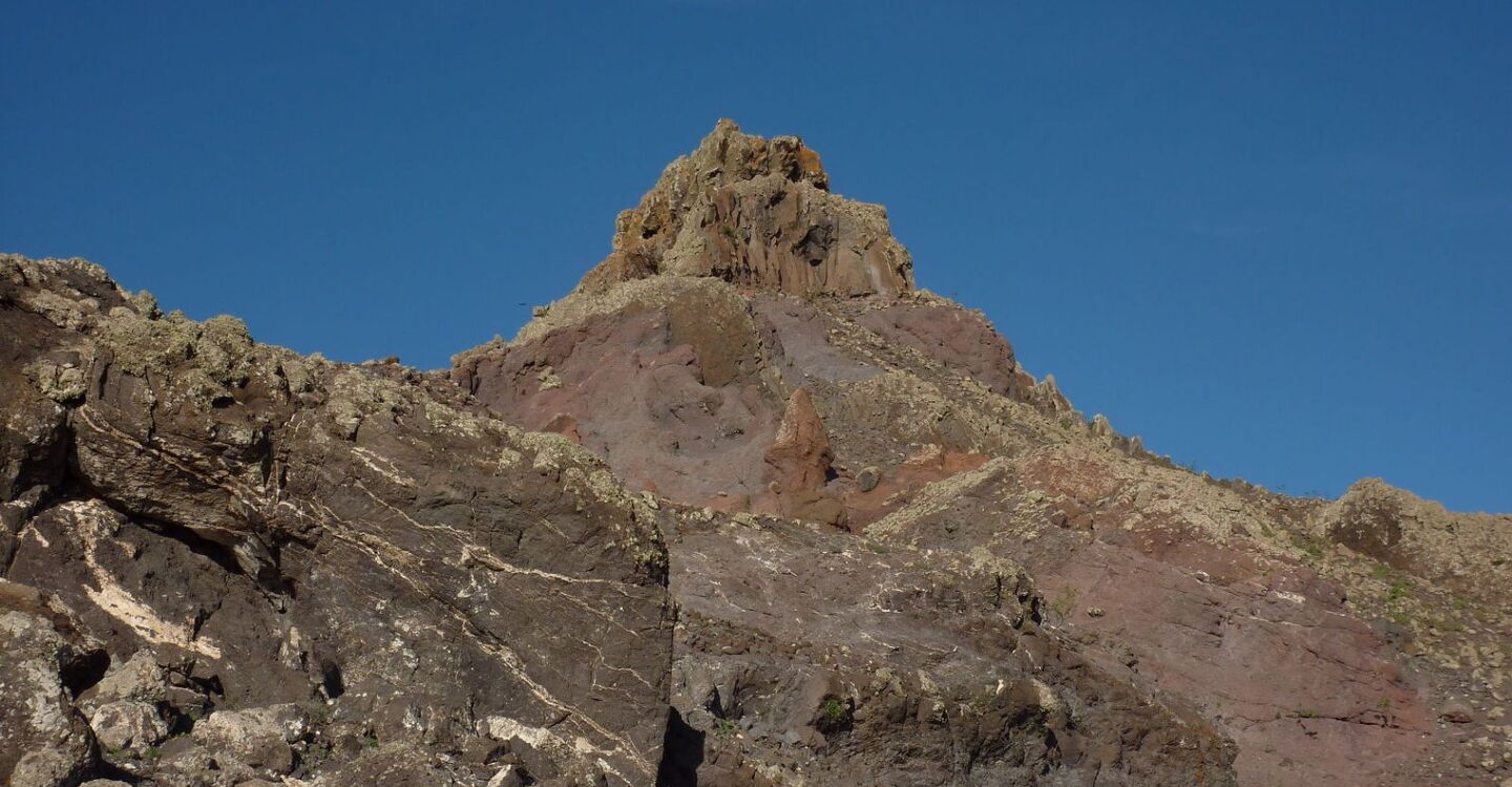 Um das (04) Naturdenkmal Montana Cardon (669 m) final zu besteigen, gehen wir ca. 80 m unterhalb des Felssockels weiter, bis wir links – durch einen kleinen, einfach zu begehenden Kamin – einen höher liegenden Felssockel erreichen. Auf diesem gehen wir nun die 80 m in die entgegengesetzte Richtung zurück, bis der Pfad eine Rechtskehre macht und aufgeschüttete Steine den Hinweis für den Aufstieg geben. Unter Zuhilfenahme der Hände erreichen wir den höchsten Gipfel.
