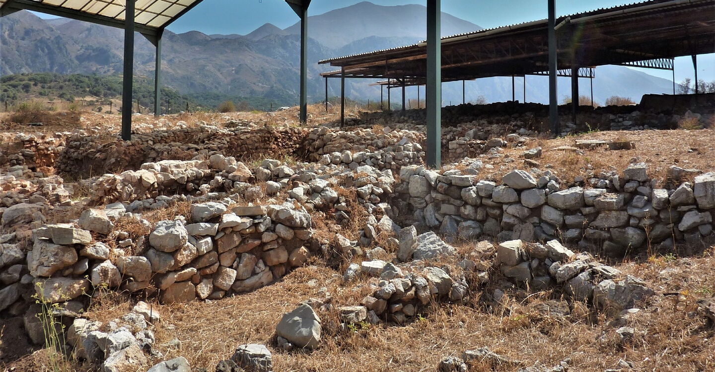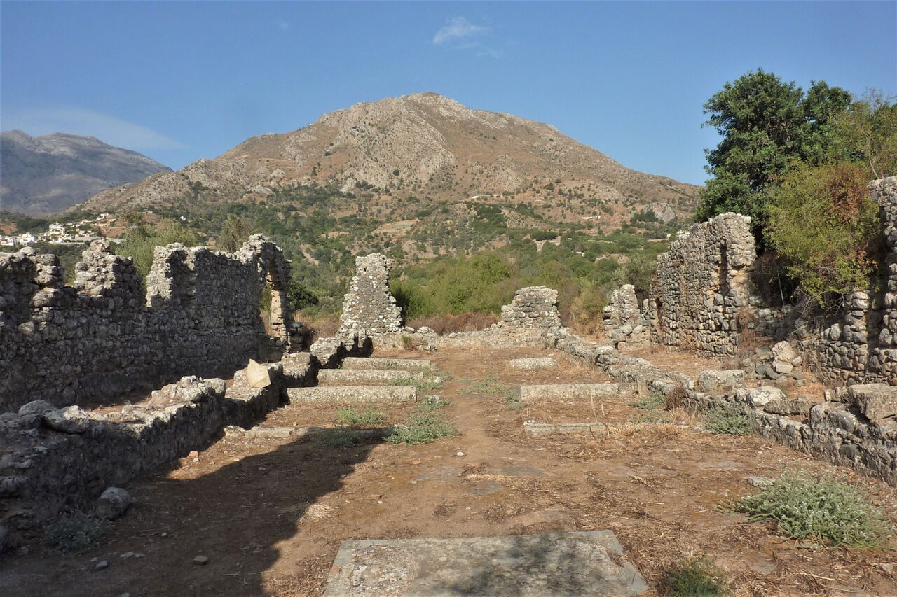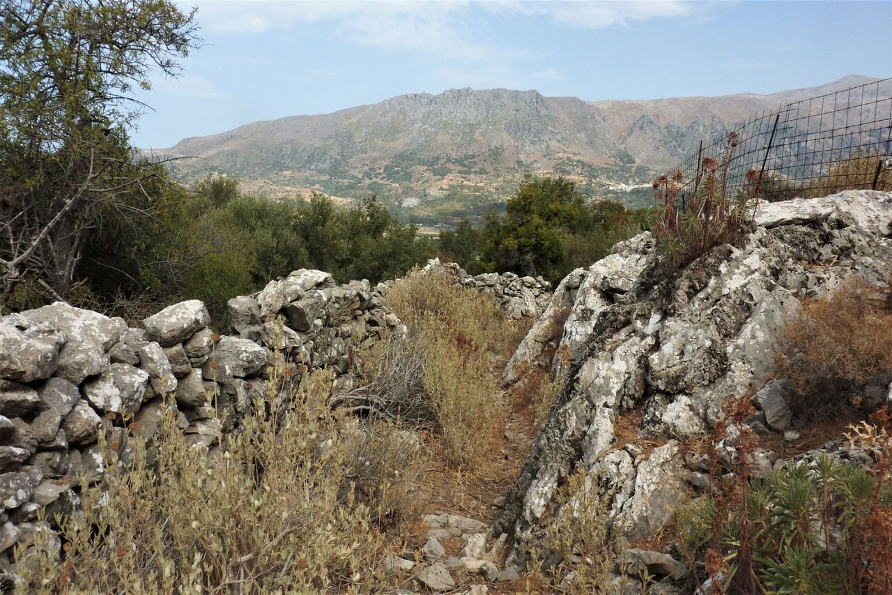 An der Weggabelung gehen wir halb links weiter, anschließend bei der nächsten Möglichkeit rechts, um nun parallel zum Wasserreservoir zu laufen. An dessen Ende bei der Weggabelung halten wir uns halb links. Nach 460 m überqueren wir eine Brücke nach links und erreichen das Dorf Lampiotes. Dort bleiben wir bei dem ersten Verkehrsspiegel auf der Hauptstraße und bei dem zweiten Verkehrsspiegel gehen wir geradeaus weiter. Nach 2,5 km erreichen wir einen Eichenwald, von links mündet eine Piste auf den Hauptweg – unser weiterer Weg, wenn wir nicht die Exkursion zum 02 palastartigen Komplex (352 m) machen. Nach weiteren 70 m gehen wir halb rechts auf dem mit einem roten Punkt markierten Pfad. Wir kommen an einer Quelle vorbei und gehen rechts durch das Dorf Monastiraki, um dann bei dem blau-grün gestrichenen Geländer rechts hinunter zu den Ruinen eines minoischen Palasts aus der Zeit von 1900 bis 1700 vor Christi zu gehen. Achtung! Die Anlage ist montags geschlossen.