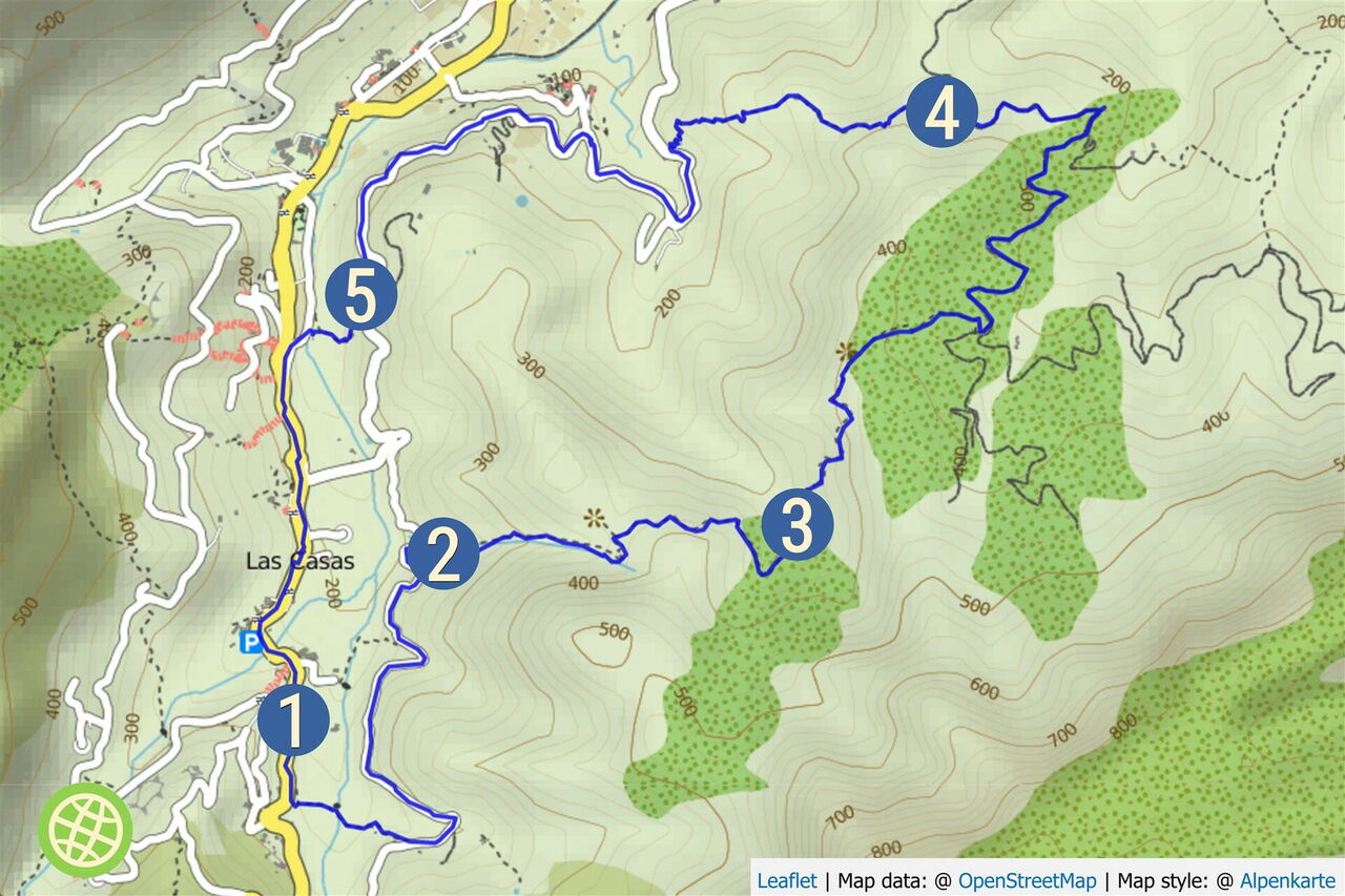 Vom (01) Start und Ziel in Hermigua (281 m) gehen wir zunächst auf der ortsauswärts führenden Straße, um bei dem Verkehrsschild für den folgenden Kreisverkehr - 100 m Vorfahrt beachten - über Treppen links Richtung San Sebastián herunterzugehen. Durch Bananenplantagen und unzählige Abzweiger queren wir das Tal. Auf der gegenüberliegenden Talseite angekommen, wandern wir 1,4 km links entlang der Asphaltstraße.
