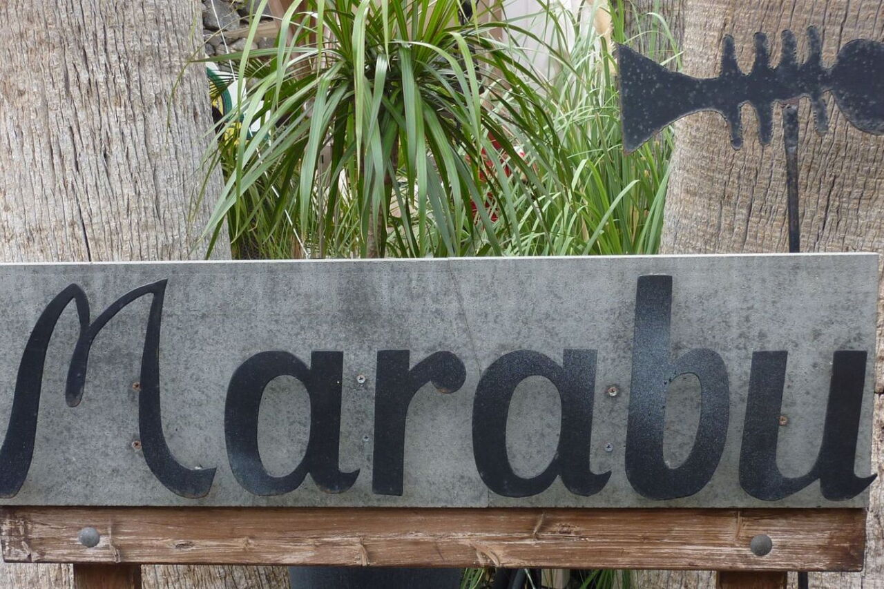 Wir gehen wieder zum Strand zurück und nach weiteren 150 m führt ein Trampelpfad steil den Hang hinauf. Linker Hand befindet sich ein Restaurant, wir gehen aber bis zur Asphaltstraße vor, um dort links in die Einbahnstraße zu gehen und ihrem Verlauf zu folgen, bis sie endet. Nach weiteren 70 m befindet sich auf der rechten Seite das (04) Restaurant Marabu (55 m).