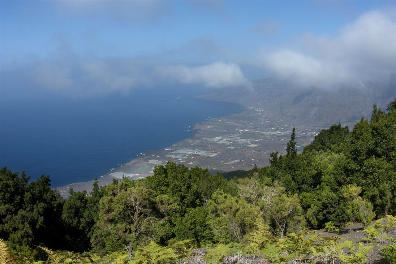 450 m hinter einem schwarzen Lapilli-Feld, das sich den Hang hinaufzieht – die Piste macht hier eine leichte Rechtskehre –, erreicht man weglos halb links über Vulkangestein einen wunderschönen Aussichtspunkt. Wir setzen unseren ursprünglichen Weg fort. Auf der Verbindungsstraße (03) HI-1 (1053 m) gehen wir 60 m links Richtung Frontera, um dann rechts auf die betonierte Piste zu biegen. Diese geht in eine Sandpiste über und bei der Weggabelung gehen wir halb rechts über die Absperrkette. Auf dem nachfolgenden Wegstück ist der Wald besonders dicht gewachsen und die Bäume sind sehr hoch – ihre Blätter bilden einen zweiten Himmel.