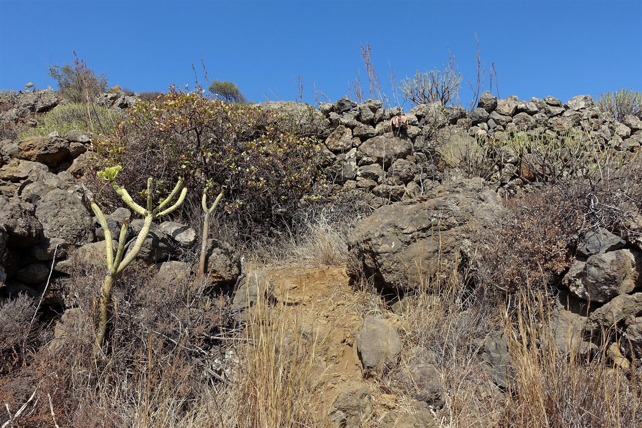 Nach 1,25 km auf der Straße Richtung Timijiraque – hier befindet sich das Verkehrsschild mit dem Hinweis 50 km/h und Fußgänger – verlassen wir die Straße nach rechts, gehen aber nicht in das Trockenflussbett, sondern etwas erhöht parallel zu einer Steinmauer. Die Mauer hat auf ungefähr halber Strecke zum Strand einen Durchlass. So erreichen wir den Strand von (04) Las Playecillas (5 m). Auf dem Rückweg folgen wir Steinmännchen und gehen parallel zur Küstenlinie, um am Ende der Piste auf der Hauptstraße links zu gehen.