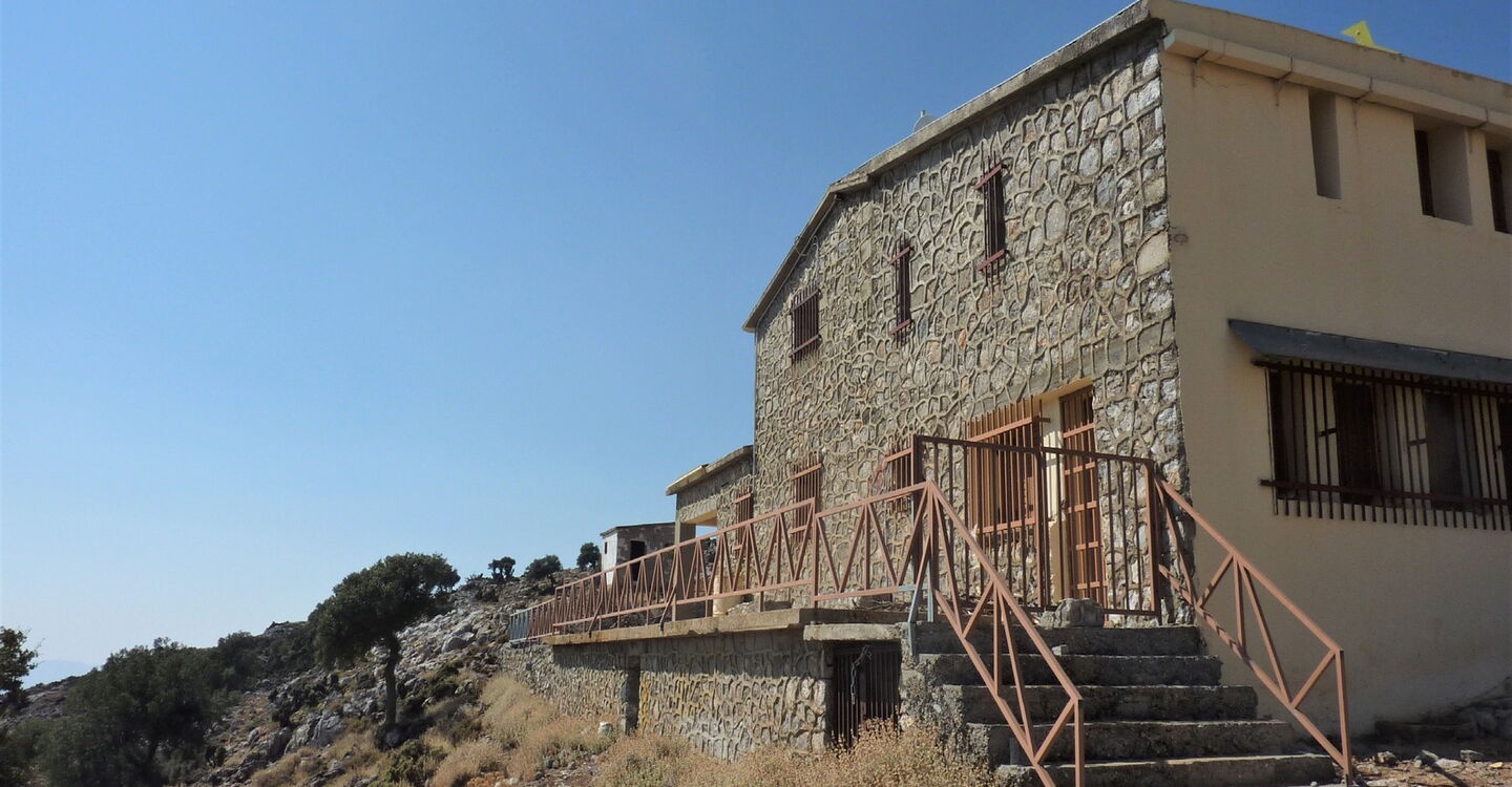 Die Markierungen ändern ihre Farbe von gelb in rot. Auf Höhe einer großen Platane kann man bereits in der Ferne die 05 Schutzhütte Prinos (1092 m) ausmachen. Die Schutzhütte Prinos liegt auf einer Höhe von 1100 m an den östlichen Hängen der Psiloritis-Berge. Von hier ergeben sich Wandergelegenheiten zu den Gipfeln Koudouni und Gyristi sowie zum Rouvas-Wald (4 Stunden) und dem Nida-Plateau (7 Stunden). Die Schutzhütte ist seit 1967 in Betrieb und hat ein Fassungsvermögen von 30 Personen. Auf Anfrage beim Mountaineering Club von Heraklion kann man dort übernachten.