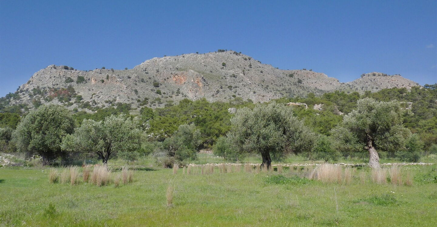 Nach einer lang gezogenen Rechtskurve erreichen wir ein kleines Tal. Bei der folgenden Dreiwegegabelung machen wir eine 180°-Kehre und gehen talwärts. Es gabelt sich abermals der Weg, aber beide Wege sind zielführend. Die folgende Piste nach rechts ignorieren wir und gehen geradeaus weiter, bis unser Weg endet. Hier am Olivenhain gehen wir (05) scharf rechts (125 m). Bei braunem Sandstein lassen wir die drei rechten Abzweiger liegen und gehen links, weiter auf der bergab führenden Piste. Auf der Asphaltstraße geht es nun zum Ziel der Wanderung.