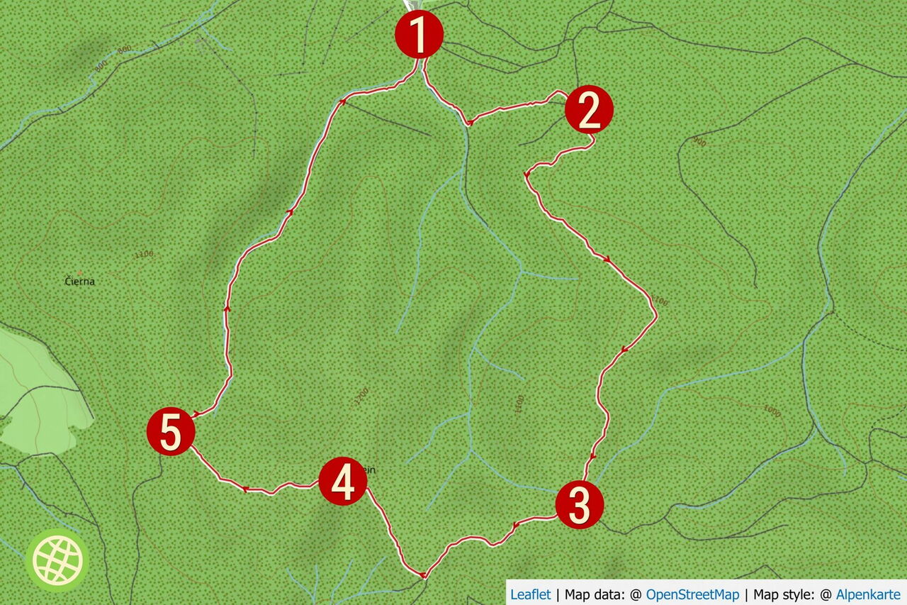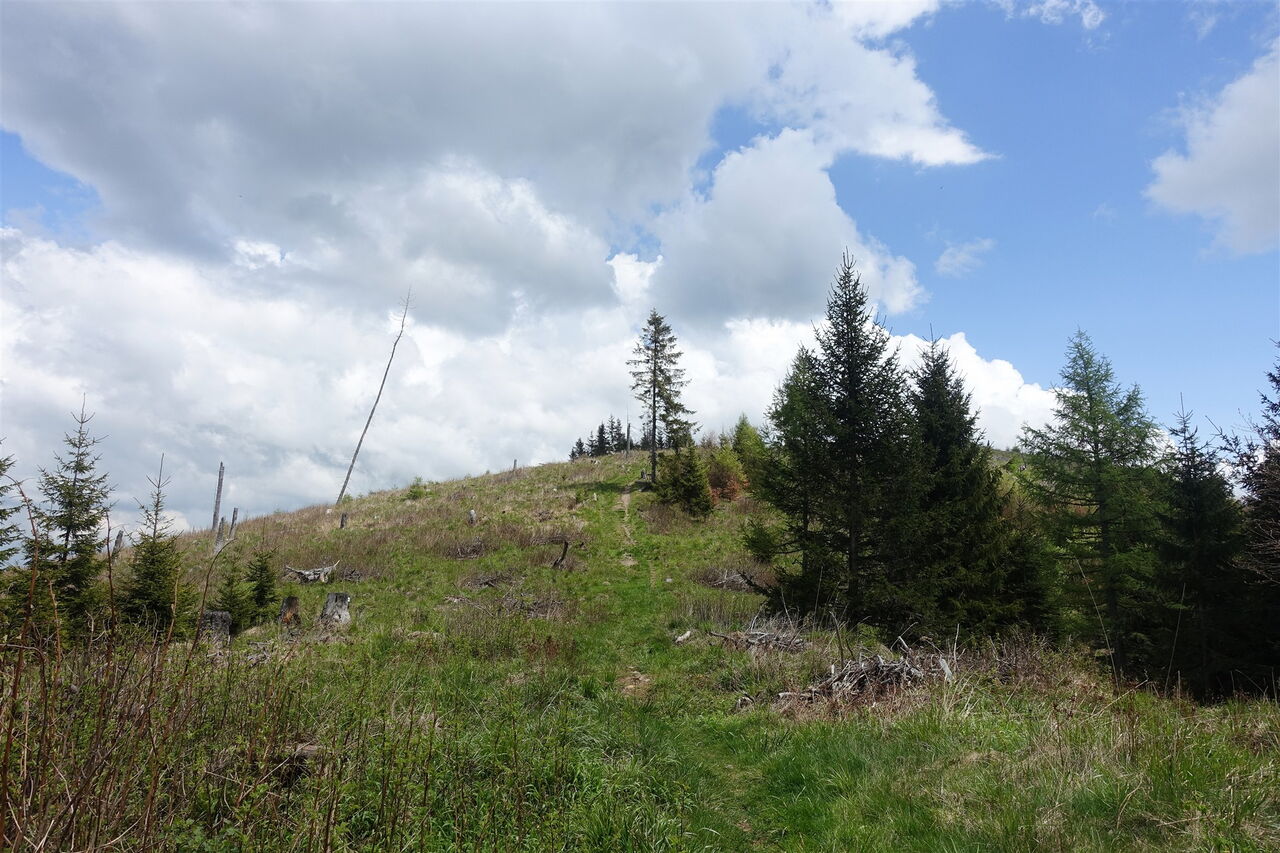Wir folgen der Forststraße durch die Rechtskehre – hier befindet sich ein Markierungsstein mit der Nummer 145. Dann überschreiten wir eine kleine Anhöhe und gehen wenige Meter zu einer Einsattelung herunter. Direkt vor uns befindet sich ein kleiner Hügel. Seinen linken Berghang queren wir auf einem zunächst unscheinbaren Pfad. Die nachfolgende Einsattelung überqueren auf einem Pfad nach rechts, bis dieser an einem 03 querenden Pfad (1168 m) endet. Wir gehen nun rechts und folgen dem blau markierten Wanderweg. Nach einem schönen Waldweg gelangen wir in offenes Gelände und können bis zum Hauptkamm der Niederen Tatra schauen. Gut zu erkennen ist der Kráľova hoľa mit seinem Funkmast (siehe Tour 25).