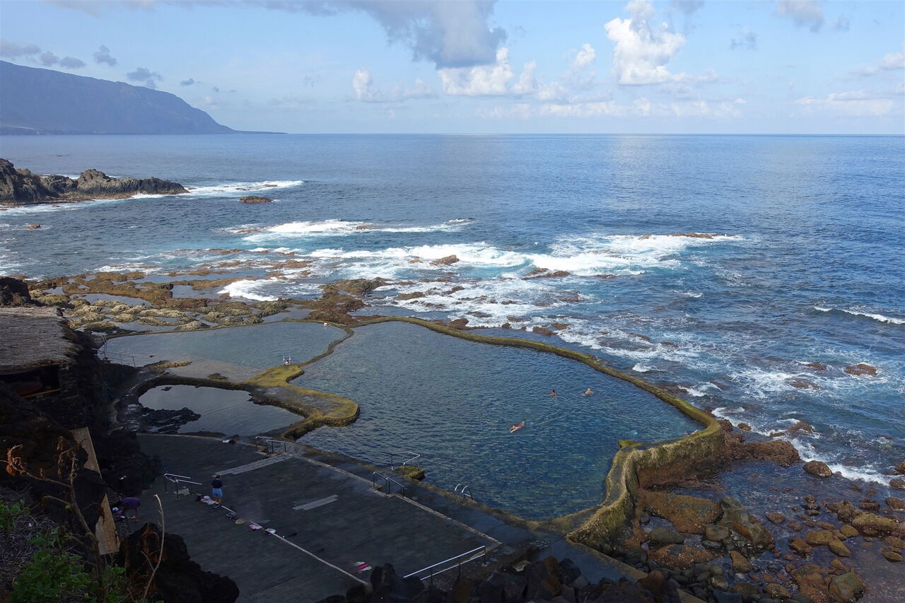 Die Badebecken von (01) La Maceta (43 m) gehören zu den schönsten auf der Insel. Besonders intensiv erlebt man hier den Sonnenuntergang. Links vom Parkplatz befindet sich ein Restaurant, erbaut aus Lavagestein, an dem wir links vorbeigehen. Ein Weg führt parallel zur Küstenlinie durch die Malpais, bis dieser an einer Asphaltstraße endet.