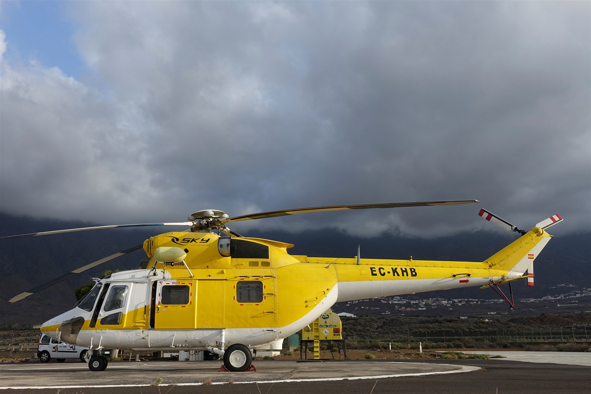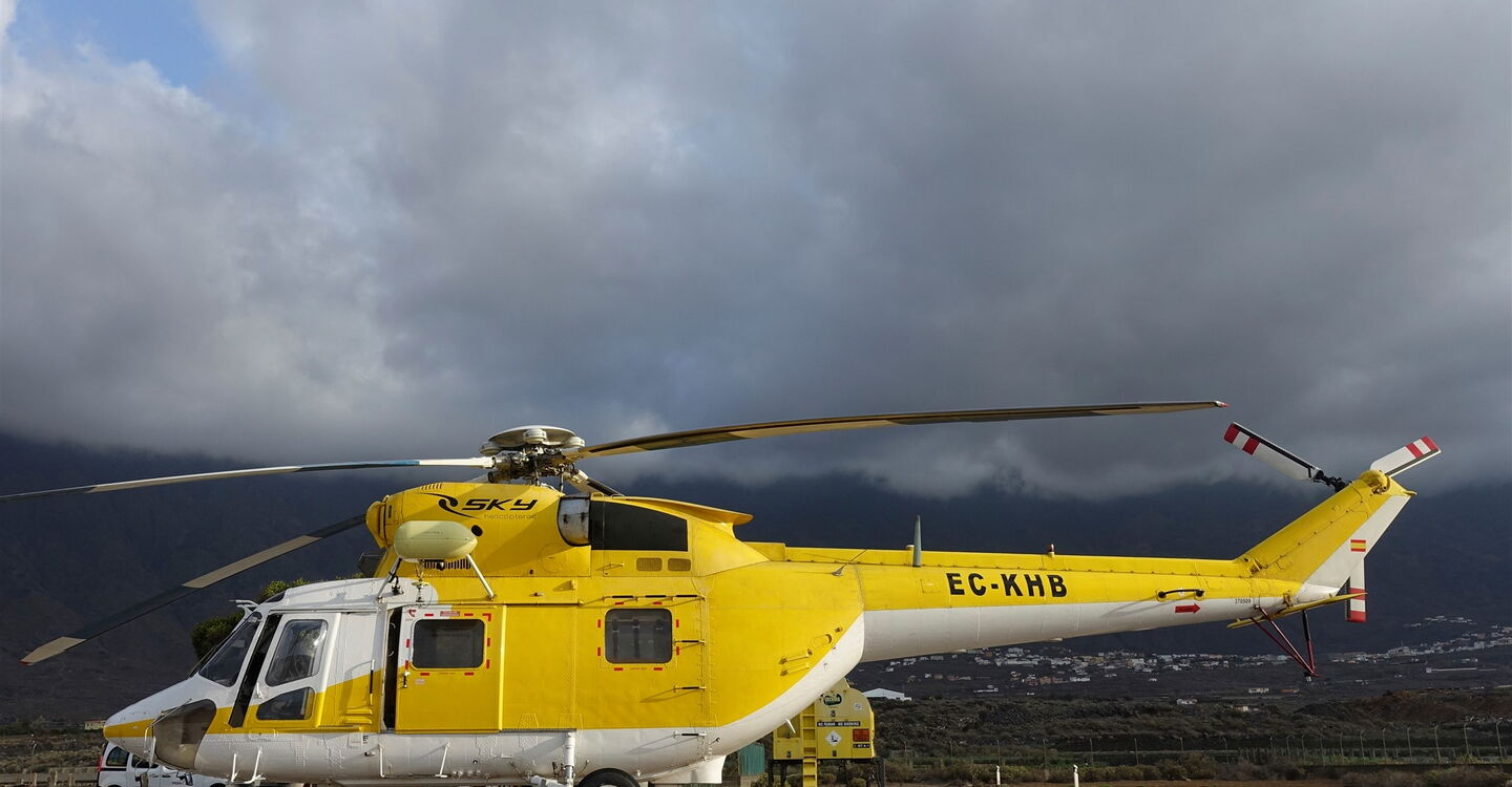 Wir setzen unseren Weg über den großen Parkplatz fort und biegen bei der nächsten Möglichkeit rechts ab, um bei dem folgenden Verkehrsspiegel links zu gehen – direkt auf einen großen gelben Hangar zu. In diesem befindet sich die Bergungs- und Rettungsgruppe (GES), die der Generaldirektion für Sicherheit und Notfall der Regierung der Kanarischen Inseln unterstellt ist. Mit viel Glück sieht man, wie der (03) SAR-Hubschrauber (37 m) zum Einsatz aufbricht oder zurückkommt. Geht man rechts in einem großen Bogen um den Hangar herum, so steht der Helikopter oft einsatzbereit vor dem Hangar. Hinter dem Begrenzungszaun gehen wir auf der Piste links und erreichen nach 375 m wieder die Asphaltstraße, an der wir parallel bis zur Verbindungsstraße nach Pozo de La Salud vorgehen.