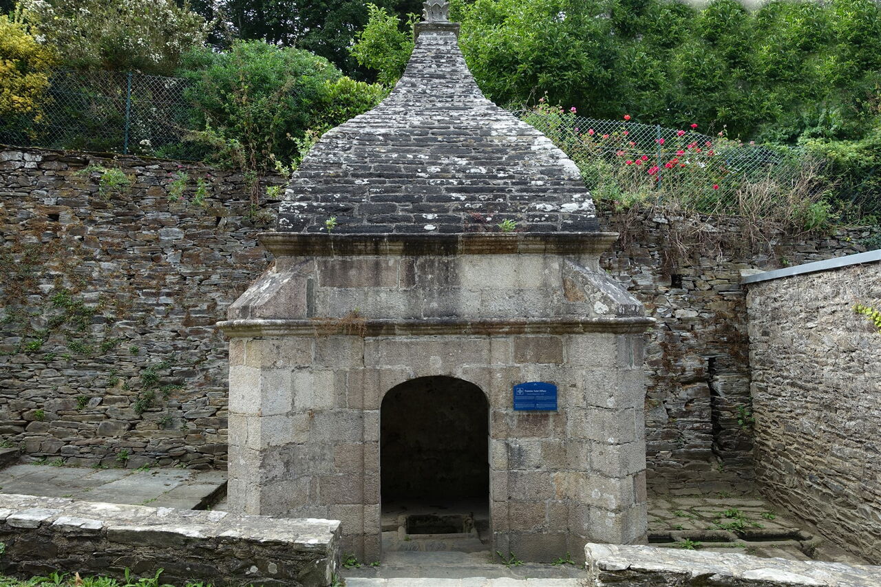Dort gehen wir geradeaus weiter bis zur Hauptstraße, überqueren diese am Zebrastreifen und gehen am Herrenhaus Manoir de Kérallic vorbei. Im weiteren Verlauf passieren wir eine Steinmauer bei einem Durchbruch, um in einem Rechtsbogen um das Herrenhaus herumzugehen und dem Wegweiser Richtung Plage zu folgen – links unterhalb sieht man den Plage La Lieue de Gréve. Nach einem kurzen Stück im Wald folgt eine 180°-Kehre und in engen Kehren geht es auf einem Pfad bis zur Straße, an der wir rechts und nach weiteren 30 m abermals rechts gehen. Dort befindet sich der aus dem 16. Jahrhundert stammende Granitbrunnen 02 Fontaine Saint Efflam (16 m). Nur wenige Meter oberhalb des Brunnens liegt die aus dem 15. bis 18. Jahrhundert stammende Kapelle Saint Efflam.