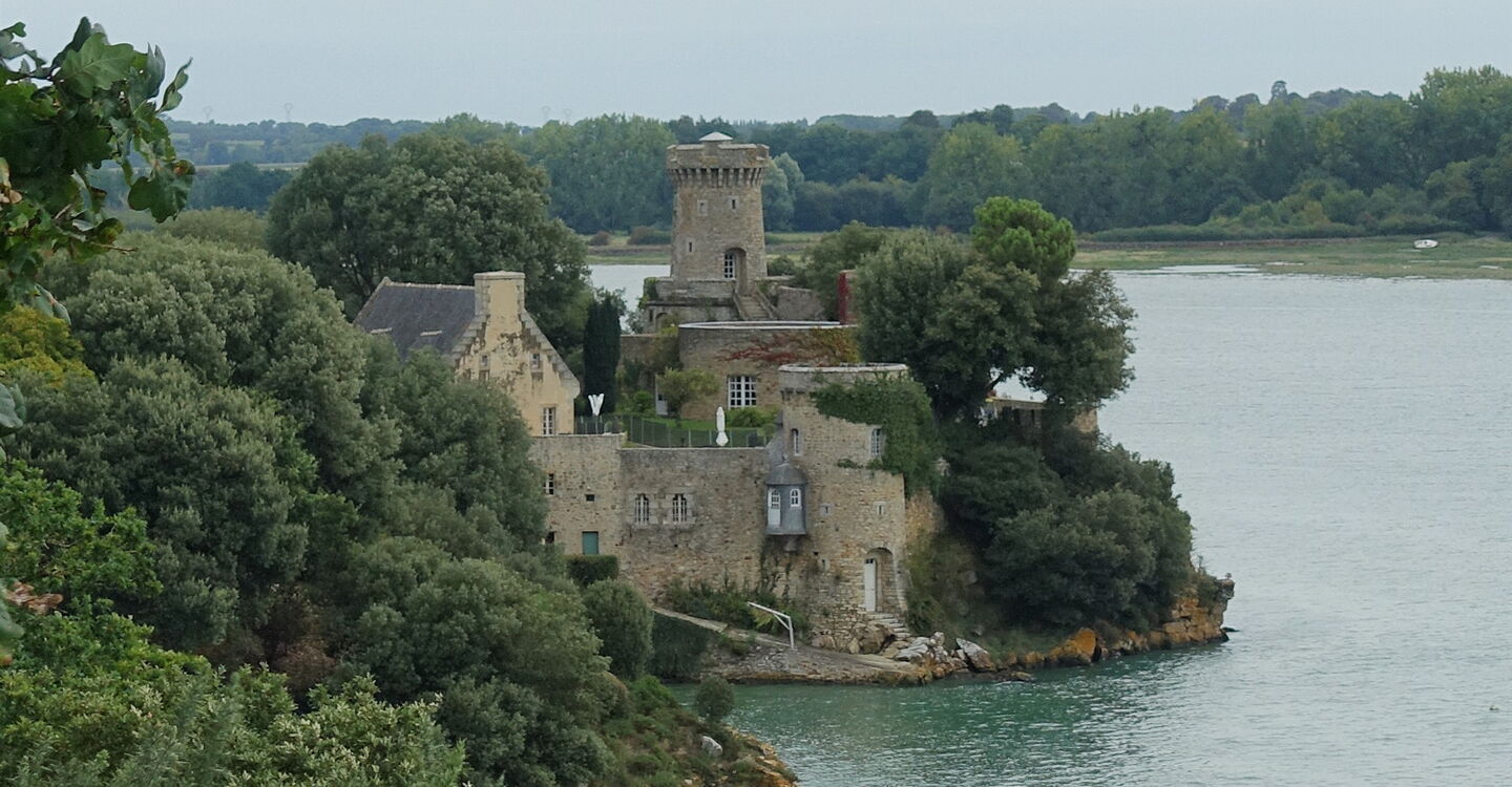 Wir überqueren eine Straße und gehen dort geradeaus an einer Reithalle vorbei. Der Weg mündet in eine rechts abzweigende Grundstückseinfahrt und wir gehen direkt auf ein Haus zu, bei dem wir rechts auf dem weiterführenden Pfad weiterwandern. Im Waldstück erreichen wir eine Weggabelung, rechts befindet ein grünes Gatter. Hier gehen wir rechts leicht bergauf an einem Zaun entlang. Ein rechter Abzweiger wird ignoriert. An der nachfolgenden Weggabelung – von dort kann man eine Hochbrücke ausmachen – gehen wir rechts, bis der Pfad endet. Dort gehen wir dann nicht links, sondern rechts bergauf und nun direkt über das private Anwesen des 02 Le Château de Péhou (30 m). Der Durchgang ist nicht verboten! Der Wanderweg wird durch Ketten begrenzt, Verbotsschilder nach rechts und links weisen auf das Privatgrundstück hin. Wir gelangen an einen Aussichtspunkt, von dem man das Schloss an der Flussmündung der Rance ausmachen kann.