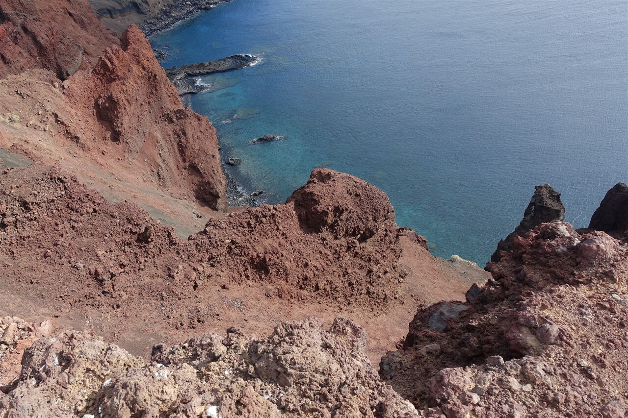 Von nun steigen wir auf Ziegenpfaden auf dem halb rechts von uns liegenden Bergrücken bis zum Gipfel der (05) Montana Restinga (209 m) auf. Dabei kann es sehr windig werden, denn die Passatwinde treffen ungebremst auf die ersten Hügelketten von El Hierro. Am Gipfel angekommen, schauen wir aus der Vogelperspektive auf das kleine Fischerdorf La Restinga. Zum Abstieg gehen wir weitere 70 m halb links auf dem Vulkankrater, um uns dann auf einem nicht so steilen, aber trotzdem gerölligen und rutschigen Untergrund in Richtung des rotbraunen Gebäudes zu orientieren, welches sich halb links unterhalb befindet. Kurz unterhalb des Gebäudes steht ein Strommast, bei dem wir auf einen Pfad Richtung La Restinga treffen. Dieser führt an der Bushaltestelle vorbei und auf einer der Straßen geht es bis zum Hafengelände herunter.