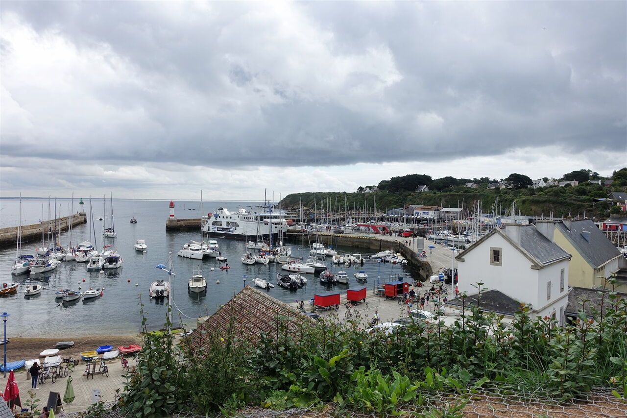 Kurz hinter einem Teich und einer Quelle gehen wir auf der nachfolgenden Straße links, um hinter dem Haus mit den roten Rollläden halb rechts auf die Piste abzuzweigen. Hinter dem Klettergarten endet die Piste und wir gehen links auf der Straße bis zur nächsten Kreuzung nach 250 m vor. Hier gehen wir rechts und erreichen die Inselhauptstadt. Durch die Fußgängerzone gehen wir direkt auf die 05 Église Saint Tudy (27 m) zu. Anstatt eines Wetterhahns ziert ein Thunfisch die Spitze des Glockenturms. Er erinnert an die Zeit Anfang des 20. Jahrhunderts, als die Insel der führende Thunfischhafen Frankreichs war. Wir verlassen den Kirchplatz in nördliche Richtung auf der Rue de St. Albin, kommen an einer Lagerhalle vorbei, gehen ein kurzes Stück neben einem Bachlauf her und biegen vor weiteren Lagerhallen links und dann sofort wieder rechts ab. Auf der nachfolgenden Straße gehen wir gerade durch ein kleines Industriegebiet. Dort, wo es links in die Sackgasse geht, gehen wir geradeaus weiter und erreichen einen schönen Aussichtspunkt oberhalb des Hafens.