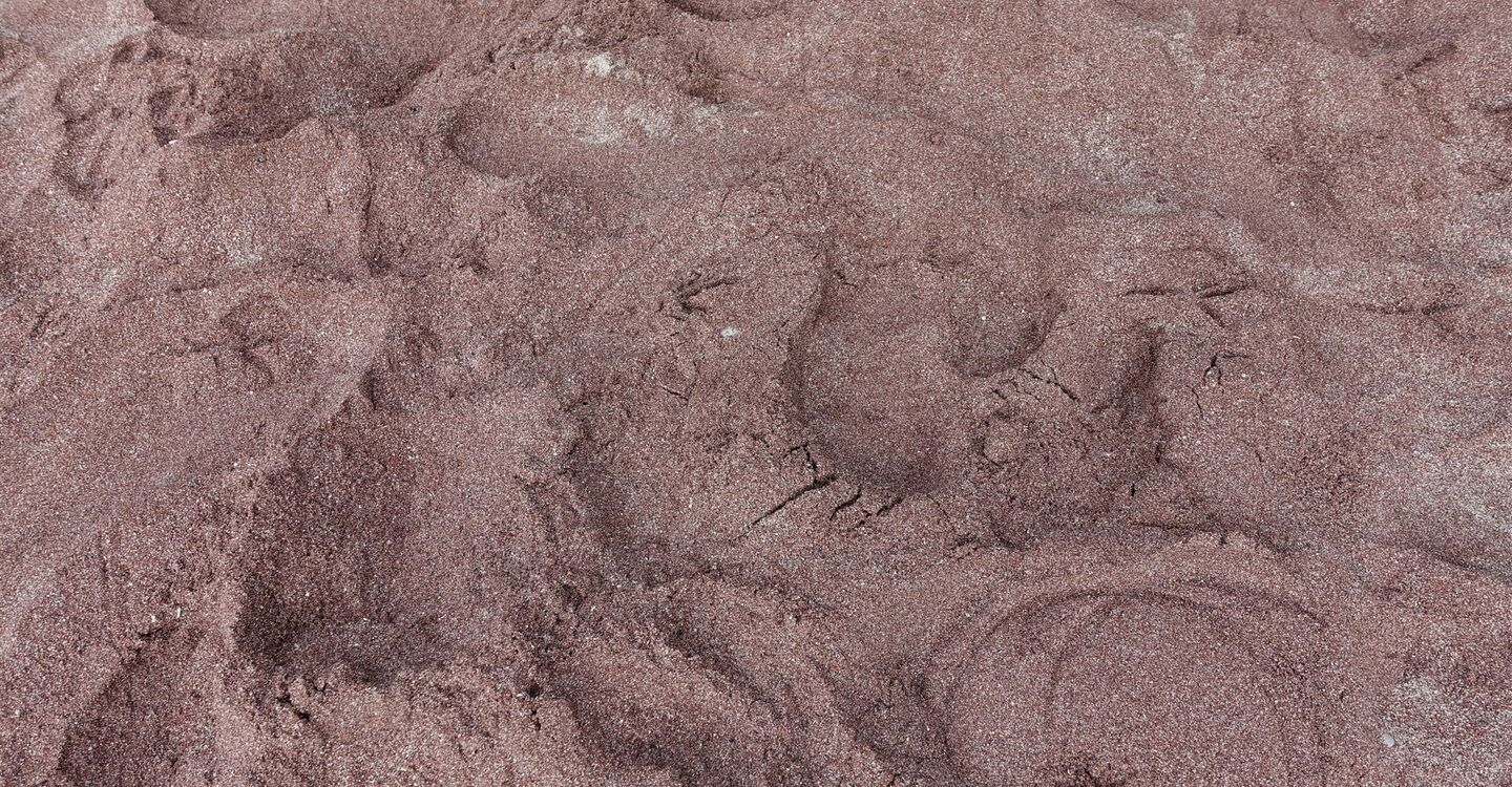 Bei einer Weggabelung gehen wir links bergauf. Nach Treppen, die bergab führen, kommen wir an der Pointe de la Groix oberhalb eines kleinen Leuchtturms vorbei. Hinter einer großen Freifläche gehen wir halb links auf der nachfolgenden Straße bergab und erreichen eine Feriensiedlung. Nach wenigen Metern entdecken wir die nächste Besonderheit der Insel am 03 Plage des Sables Rouges (9 m), nämlich den rot gefärbten Sandstrand. Hinter drei schönen Buchten steigt die Straße an, wir orientieren uns in Richtung des Landesinneren, aber bei einem großen Felsen biegen wir scharf links ab.