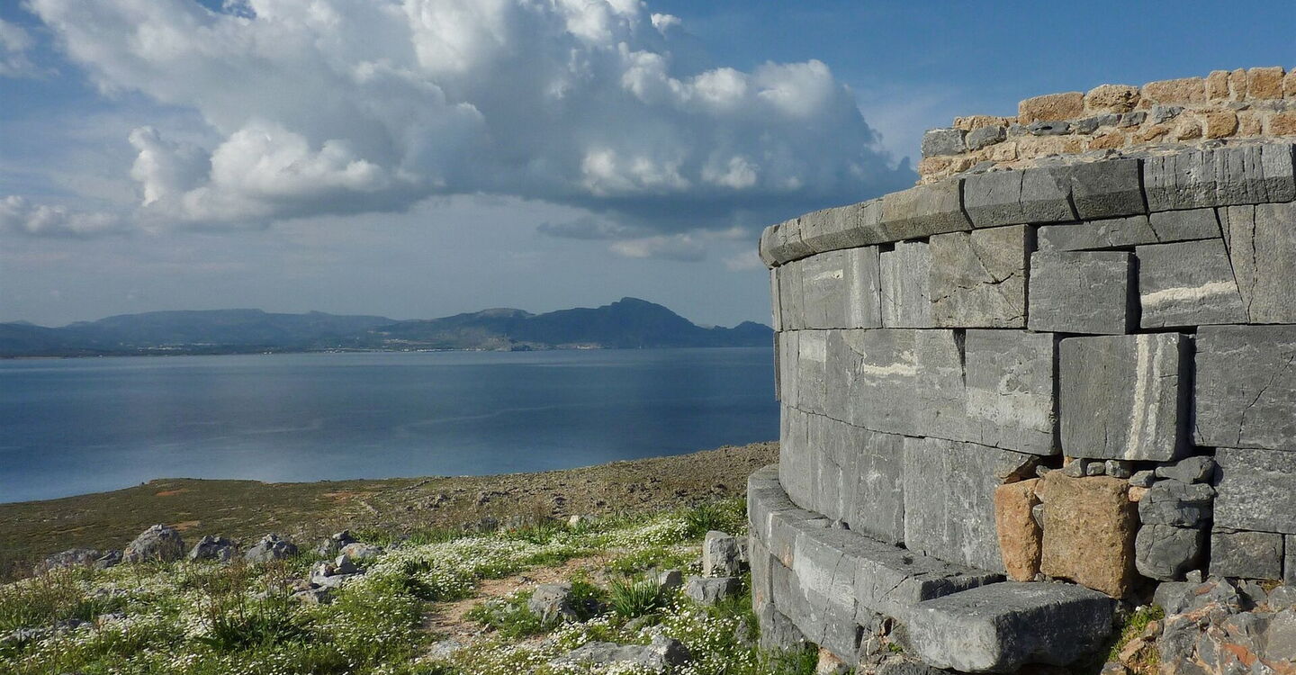 Wir erreichen abermals die Überreste einer Steinmauer, folgen ihrem Verlauf 10 m und gehen nun halb links und weglos auf das (04) Grab des Kleobulos (49 m) zu. Kleobulos lebte im 6. Jahrhundert vor Christi und war einer der 7 Weisen der Antike. Er lehrte philosophische Zitate und war eine hoch angesehene Persönlichkeit der Antike. Man sagt, sein Grab befindet sich auf dem markanten Felsen am Kap Ajios Amilianos oberhalb von Lindos. Ob Kleobulos tatsächlich dort begraben war, ist nicht erwiesen, denn Archäologen fanden ein gänzlich geplündertes Grab vor.