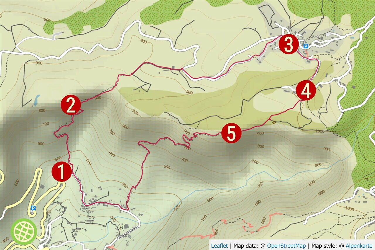 Vom (01) Start Ziel Lomo del Balo (425 m) gehen wir auf der Calle San Antonio rechts in Richtung des Restaurants Marcondo. Nach 100 m, hinter einer Brücke, beginnt links im Barranco der Camino Richtung Las Hayas. Wichtig: Im Barranco gleich der weißgrünen Markierung folgen und nicht das Barranco auf einem weiterführenden Pfad verlassen. Erst im weiteren Verlauf verlassen wir das Barranco und gehen nun durch die meterhohen Terrassenfelder. Der Weg wird zunehmend steiler, einige Stellen sind etwas ausgesetzt und wiederum andere Wegstücke sind von Erdrutschen verschüttet und schwer auszumachen.