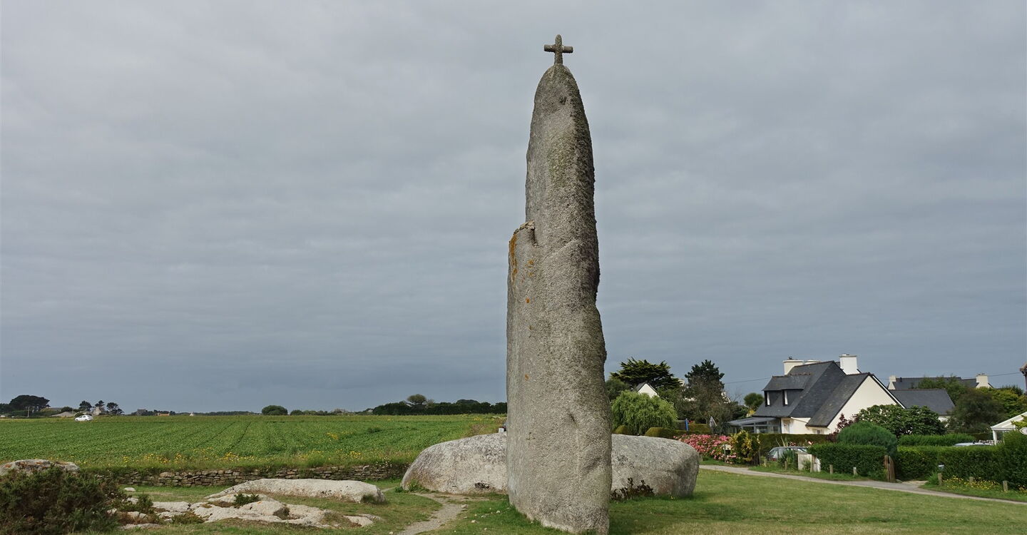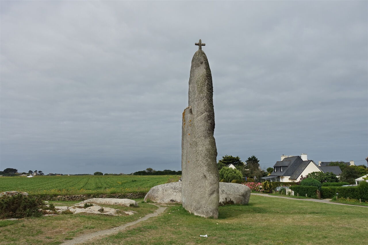Über Felder und einen mit Betonplatten verlegten Pfad gelangen wir an ein Kreuz. An dieser Weggabelung gehen wir links und überqueren die nachfolgende Straße. Der darauffolgende Pfad führt durch eine Linkskurve und endet am Feldrand, wo wir rechts weitergehen. Den nachfolgenden rechten Pfad ignorieren wir. Bei links am Wegesrand liegenden Steinen ignorieren wir den rechten Abzweiger und kurz später mündet der Pfad in eine Straße, auf der wir geradeaus weitergehen. Die Straße mündet schließlich in eine weitere Straße, rechts befindet sich ein Kreuz, wir gehen geradeaus weiter. Dort, wo die Straße in eine Kreuzung mündet, gehen wir rechts und erreichen den 02 Menhir Men Marz (17 m), ein Megalithmonument aus der Vorzeit. Mit 8,50 m Höhe ist er der vierthöchste Menhir in Frankreich. Ein Granitkreuz auf der Spitze ist Beweis der Christianisierung.
