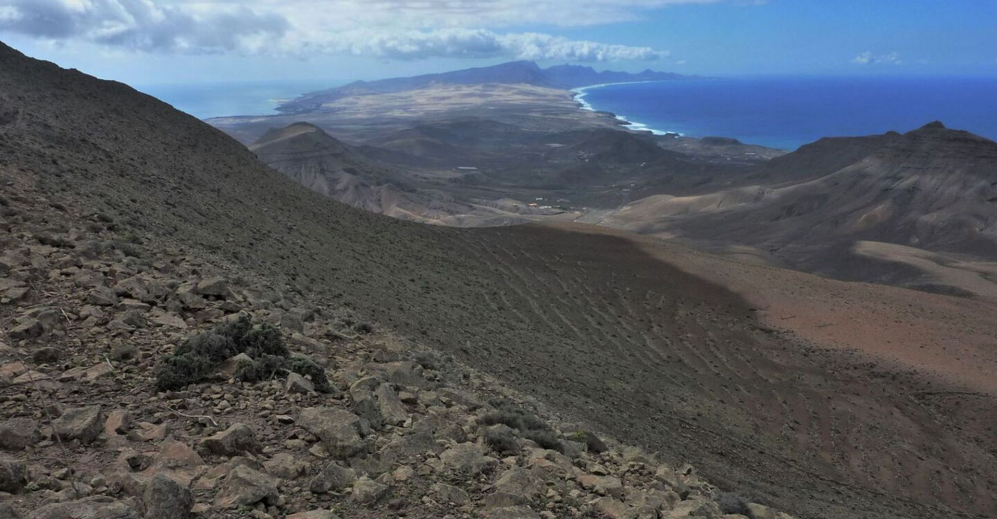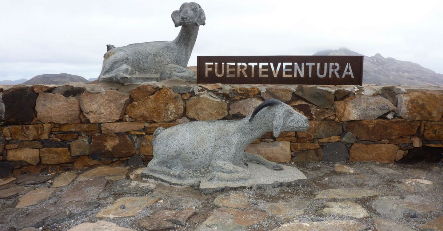 Nach nur 60 Höhenmetern und 410 m Entfernung ist bereits der Mirador (02) Astronomico de Sicasumbre (461 m) erklommen. Am Mirador aufgestellte Ziegenskulpturen des bekannten Bildhauers Juan Miguel Cubas ergeben das perfekte Szenario für ein Urlaubsfoto: im Vordergrund die Ziegen mit Familie und am Horizont die Jandia-Halbinsel mit dem gewaltigen Jandia-Bergmassiv. Am Mirador, direkt neben dem fest installierten Fernrohr und einem kleinen Steinhäufchen, führt auf dem vor uns liegenden Bergrücken ein schmaler Pfad in südliche Richtung talwärts.