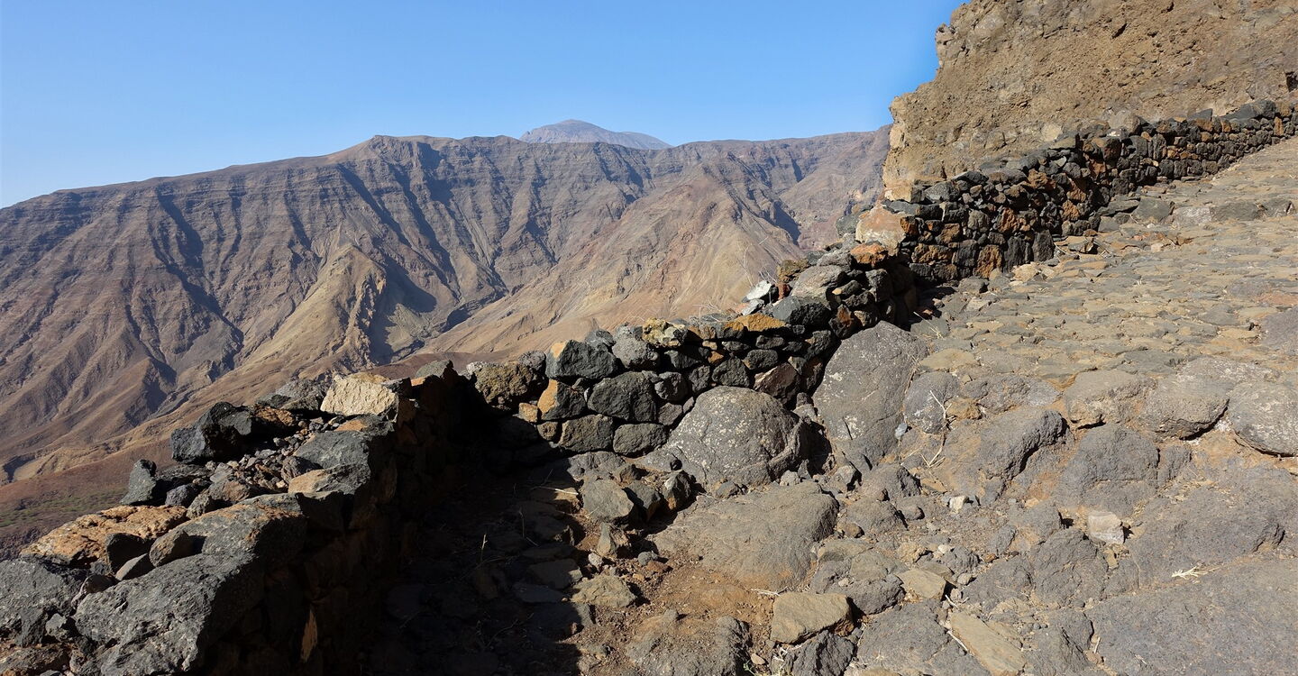In der Vergangenheit wurde der komplette Warenverkehr mit dem Dorf über einen Caminho geregelt, eine Zufahrtsstraße gab es noch nicht. Dabei waren jedes Mal 530 Höhenmeter zu überwinden. Am Miradouro befanden sich eine große Verladestelle und eine Lagerhalle, in der die Waren auf ihren Weitertransport warteten. Der alte Caminho ist inzwischen in die Tage gekommen und wird heutzutage auch nicht mehr für Transportzwecke genutzt. Geblieben ist ein wunderschöner Wanderweg, von dem man im oberen Abschnitt einen spektakulären Blick auf den höchsten Berg von Santo Antão genießt. Nachdem man den Pass überschritten hat, führt die Tour durch eine rotbraune Wüstenlandschaft, bis zu einem der schönsten Strände von Santo Antão. Zur Blauen Stunde ist diese Runde ein ganz besonderes Erlebnis.