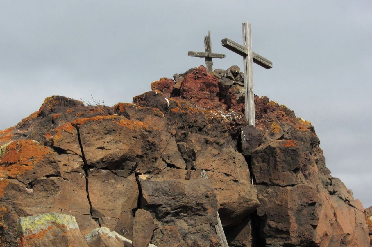 Es folgt ein weiteres Stück mit mäßiger Steigung, bevor der endgültige Anstieg bis zur (05) Montana Areguia (492 m) beginnt. Das Gipfelkreuz liegt etwas erhöht auf einem Basaltsteinkomplex. Die Aussicht unterhalb des Gipfelkreuzes ist einfach gigantisch. Der Blick von hier oben ist atemberaubend. Man schaut auf die wilde Westküste von Fuerteventura, weiter links erkennt man an den Sandfarben die Dünenlandschaft des Jandia-Nationalparks und am Horizont erheben sich die südlichsten Gipfel der Insel.