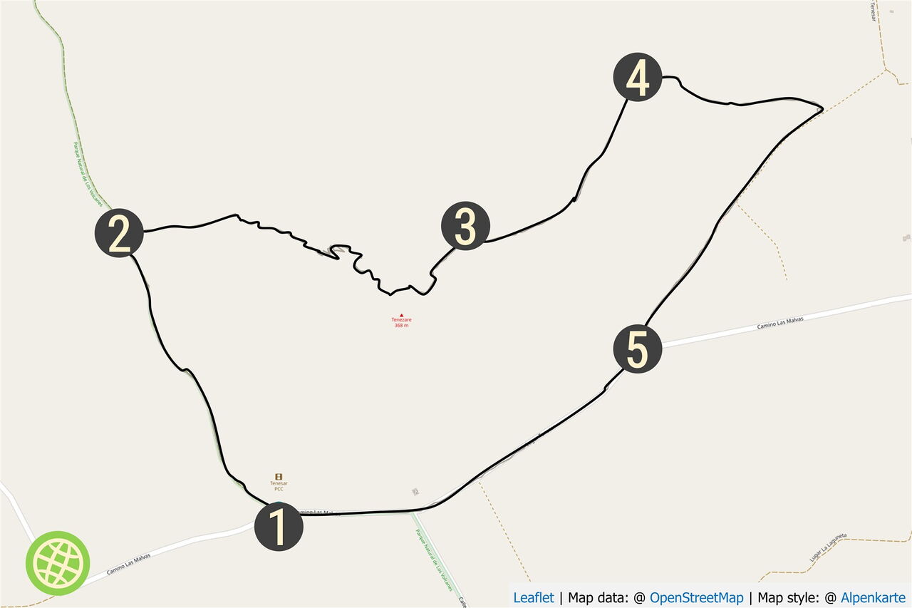 Mit den Buslinien 16, 52 und 53 gelangt man von Arrecife nach Tinajo. Zum Start müsste man noch 4 km einfach laufen (siehe Pkw-Anfahrt). Mit dem Pkw beträgt die Strecke auf der LZ-20 22 km. An der großen Norfolktanne in Tinajo biegt man rechts in die Calle Laguneta ein und folgt dieser für 3,3 km. Inzwischen sind wir an der rechts von uns liegenden Montaña de Teneza vorbeigefahren, um bei einem rechten Abzweiger - eine Schranke versperrt die Durchfahrt - zu parken. GPS-Koordinaten 29.061717 -13.7106.