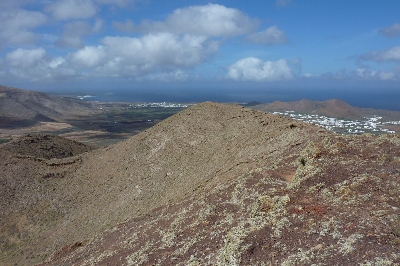 An dieser Stelle verlassen wir den Hauptweg nach rechts in den Hang. Dabei steigen wir links vom Loch, weglos in Kehren, bis auf den Gipfel der (05) Montaña de Guenia (358 m). Im weiteren Verlauf führt der Pfad auf dem Grat entlang, bis wir in den offenen Vulkankessel schauen können. Links auf dem Grat führt ein Weg in den Vulkangrund, aber wir gehen rechts auf dem Grat entlang, um dann steil und weglos abzusteigen. Wir treffen auf eine Schotterpiste und gehen diese links durch ein Barranco. Nach einer Rechtskehre erreichen wir die Asphaltstraße. 250 m später verlässt ein Pfad die Asphaltstraße nach rechts zu einem Gebäude, um anschließend wieder auf die Asphaltstraße zu gelangen. Vorbei geht es am Friedhof, in Kehren bergab, über die LZ-1, um dann zum Start und Ziel in Guatiza zu gelangen.