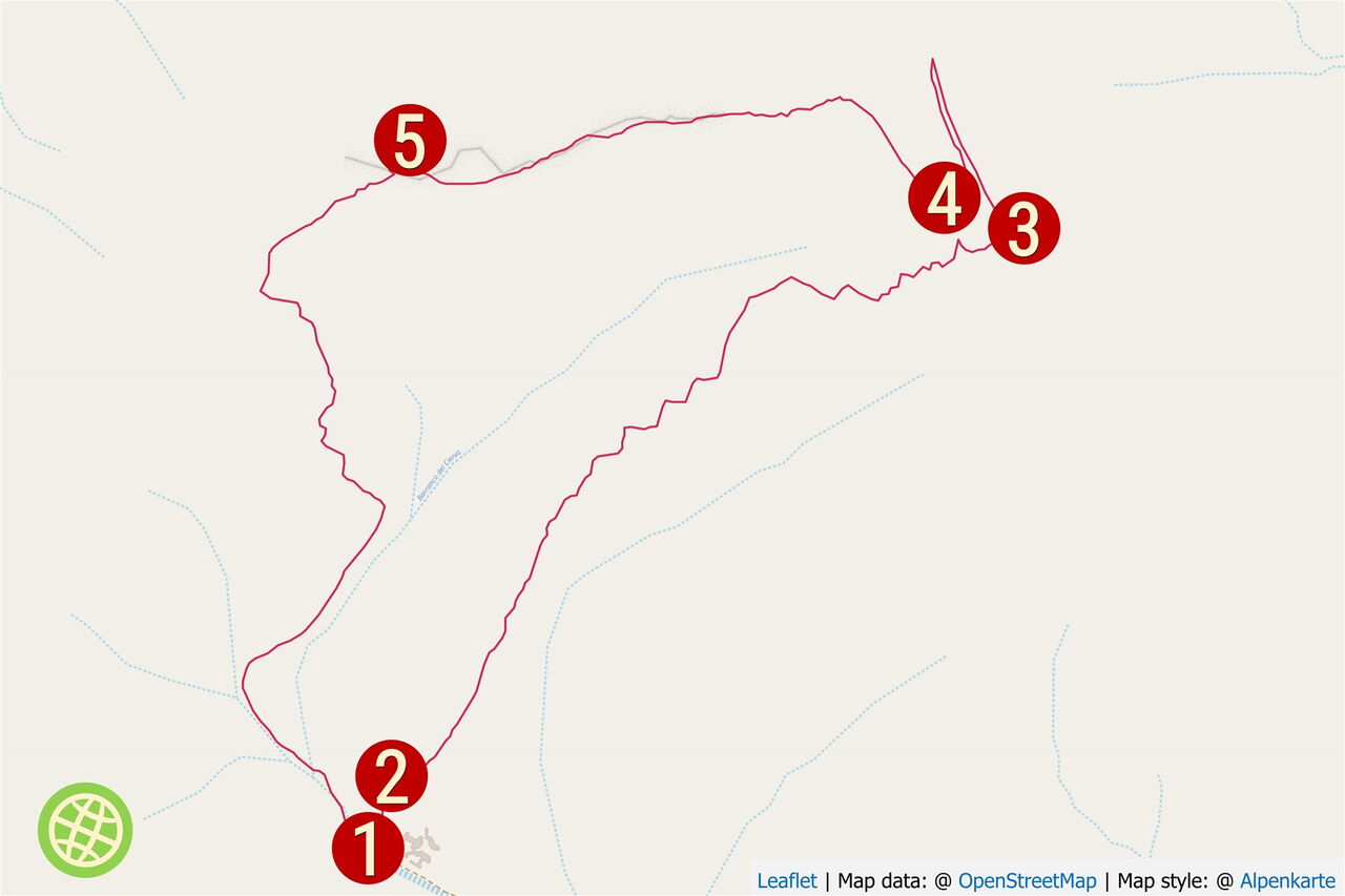 Komplett wegloser Anstieg auf schwierigem Schotteruntergrund. Art des Weges: 100 % Schotterweg. Weitere Ausrüstungsempfehlungen: Das Laufen mit Wanderstöcken erleichtert den Auf- und Abstieg auf rutschigem Untergrund. Einkehrmöglichkeit: keine. Beste Wanderzeit: ganzjährig.