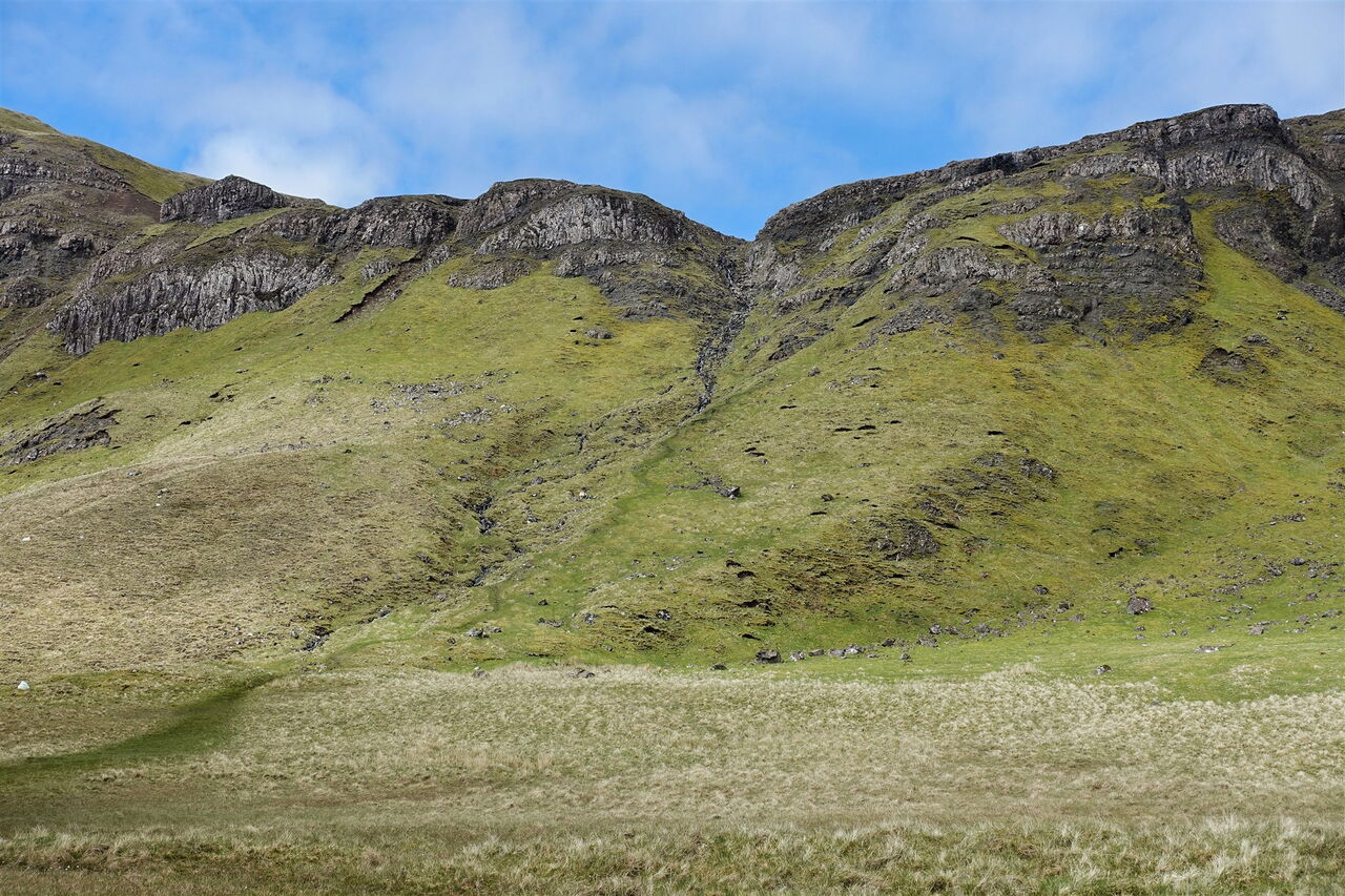 Dieser führt nun spektakulär entlang der Abbruchkante des mächtigen Erdrutschs vor 15.000 Jahren und gewährt faszinierende Tiefblicke auf den Old Man of Storr und seine Kinder. Während sich unterhalb an schönen Tagen die Touristenscharen drängen, steigen wir im Alleingang auf Grashängen bis zum Gipfel des 03 The Storr (719 m) auf. Während die felsige Ostseite des Gipfels gut 300 Höhenmeter senkrecht abfällt, sind das Gipfelplateau sowie seine Ostseite dagegen unspektakulär, leicht abfallend und mit Gras bewachsen. Ja, das Grün ist so kurz gehalten, dass man es als "Englischen Rasen" bezeichnen könnte, wären wir nicht in Schottland.