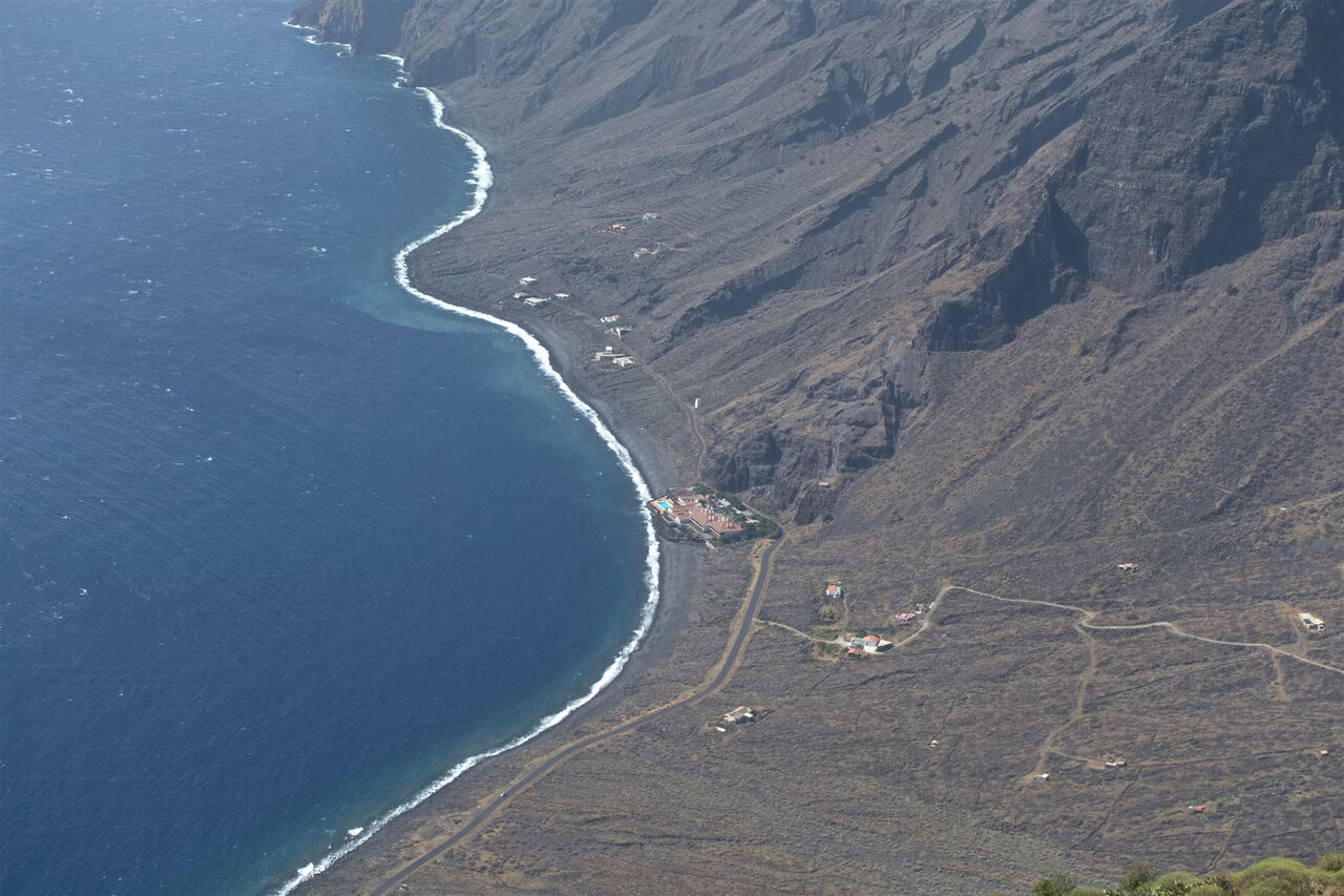 Wieder auf einer Asphaltstraße gehen wir nur einige Meter rechts bis zum (05) Mirador de Isora (831 m), es eröffnet sich ein spektakulärer Tiefblick auf die Bucht. Es folgt ein gerölliger Abstieg durch den extrem steilen Berghang. Dabei sollte man Folgendes bedenken: Der Abstieg von Mirador de Isora nach Las Playas wurde angelegt, um die Wandertierhaltung zwischen Berg und Tal zu gewährleisten. Außerdem wurde die Route genutzt, um sich in der Trockenzeit an der Quelle von Las Playas mit Trinkwasser zu versorgen oder um zum Fischen an die Küste zu gelangen. Eigentlich kann man sich beim Abstieg nicht verlaufen, aber trotzdem gibt es eine Schlüsselstelle. Nachdem wir den Bergrücken hinter uns gelassen und ein Trockenbachbett erreicht haben, folgen wir nicht dem Verlauf, sondern queren dieses und steigen noch einmal zu einer Anhöhe auf. Von dort führt der Camino bis zu der Streusiedlung Las Playas. Im weiteren Verlauf gelangen wir bis zur Hauptstraße, die direkt zum Hotel Parador führt.