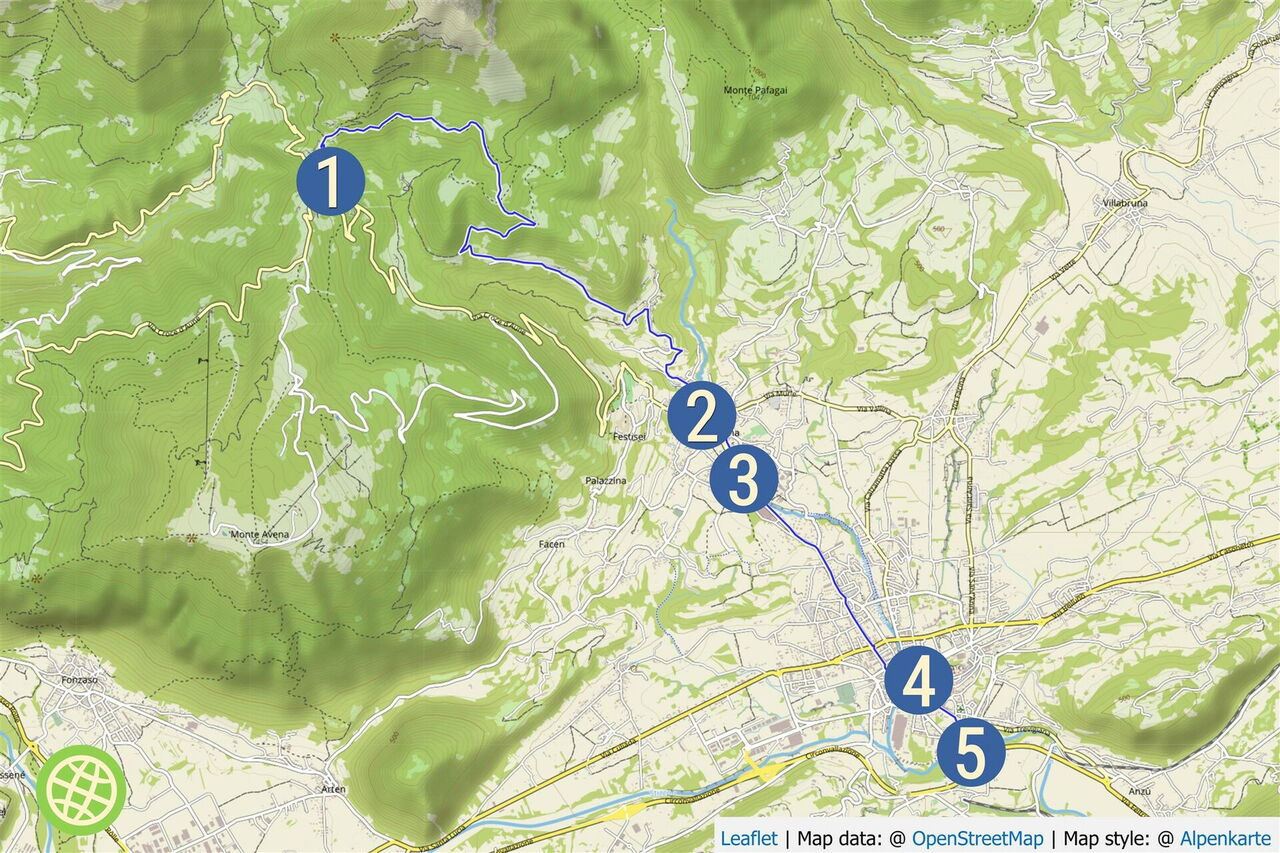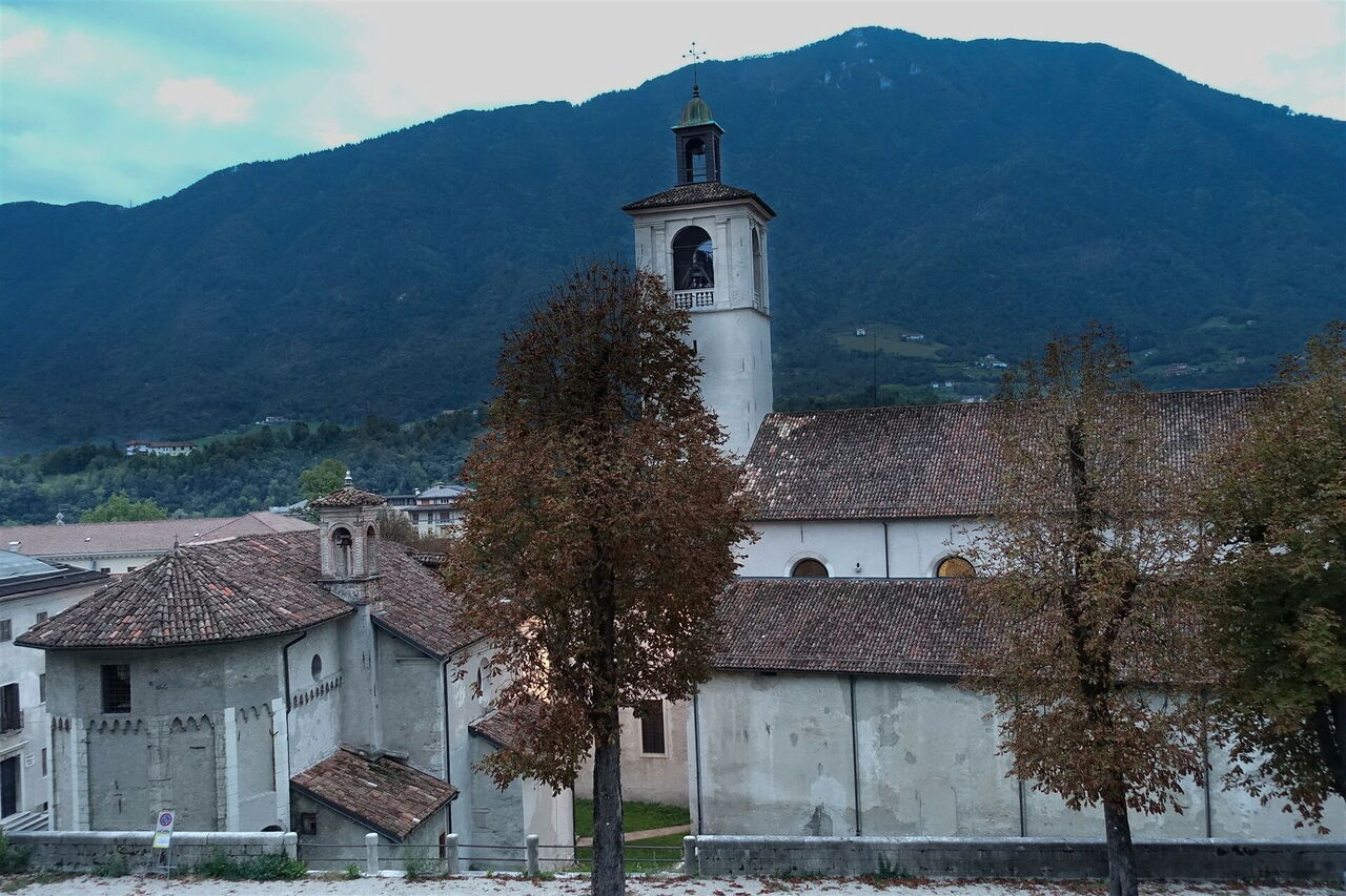 Auf dem Fußweg entlang der Hauptverkehrsstraße – die Zivilisation hat uns spätestens hier wieder eingeholt – gehen wir nun Richtung Ortszentrum. Weitere schöne Villen befinden sich rechts und links der Straße. An einer Kirche gabelt sich die Straße, wir gehen geradeaus auf der Viala Farra weiter. Hinter der ehemaligen Kaserne gehen wir direkt in die Einbahnstraße. Nachdem wir den Bachlauf überquert haben, spazieren wir unterhalb der Stadtmauern halb rechts durch eine Einkaufsstraße. Bei einer weiteren Straßengabelung blickt man halb links entlang der Stadtmauer aus dem 16. Jahrhundert bis zu der 04 Chiesa di San Giacomo Feltre (237 m).