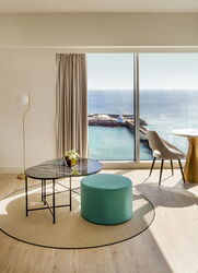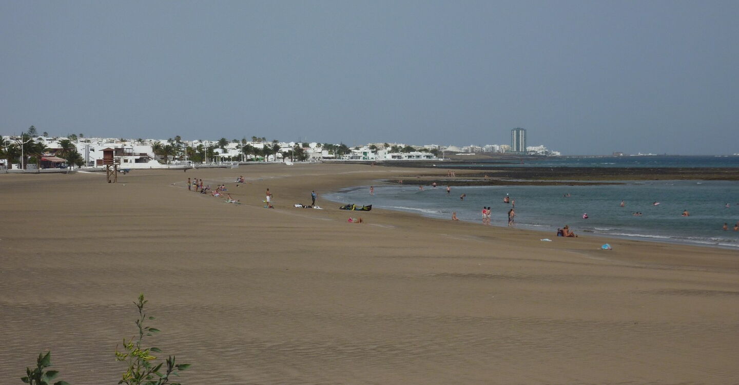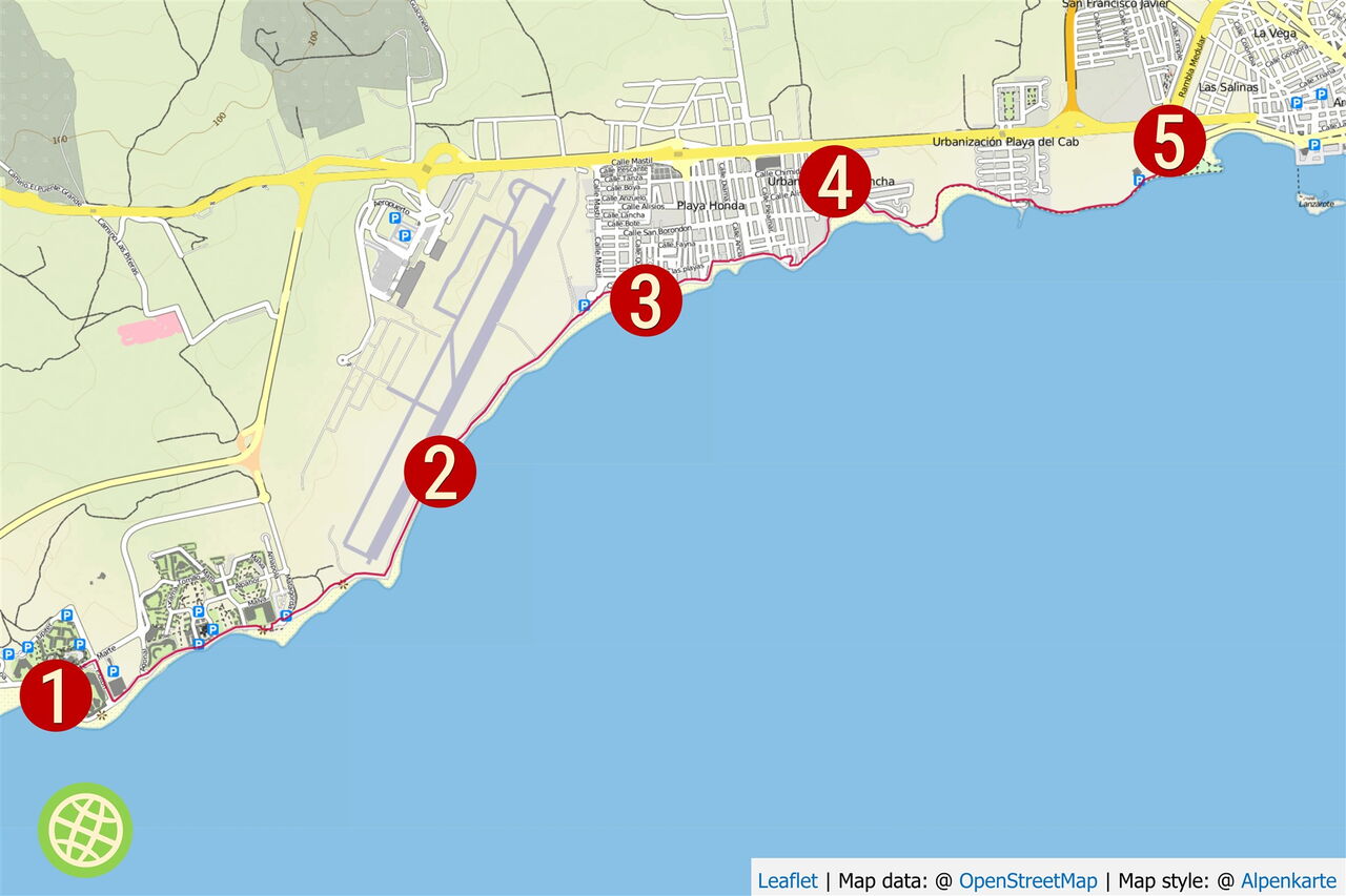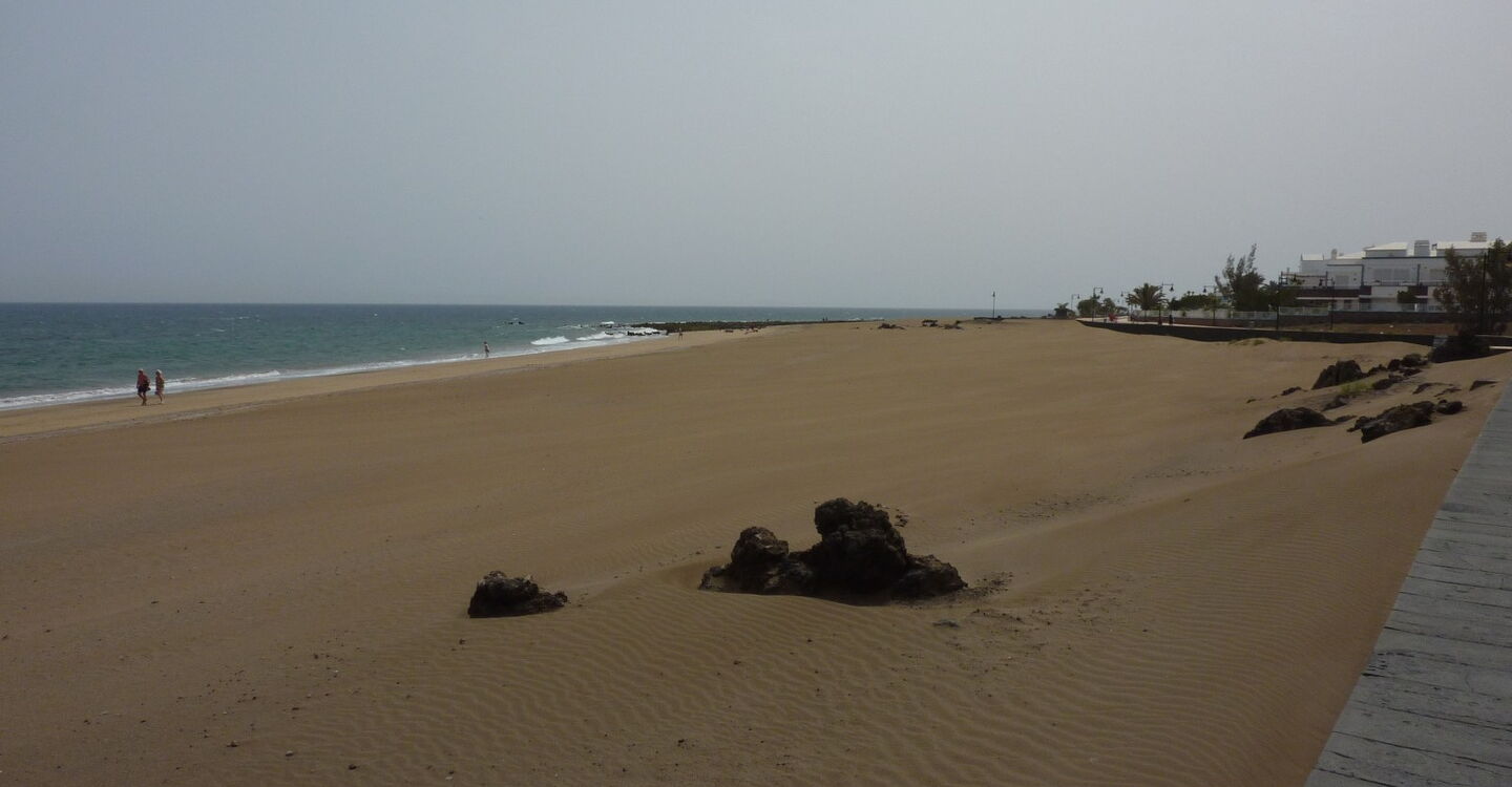 Vom (01) Start (2 m), der Bushaltestelle, gehen wir 150 m auf der Calle Marte in nordöstlicher Richtung - entgegengesetzt der Pkw-Anfahrt - bis zum Kreisverkehr vor, um auf Höhe des Hotels Seaside Los Jameos Playa die erste Ausfahrt rechts in die Calle Pluton zu nehmen. Wir treffen auf die Promenade, wo der 2,2 km lange und bis zu 200 m breite hellsandige Playa de los Pocillos in den 1,2 km langen und bis zu 50 m breiten Playa Matagorda übergeht. Wir befinden uns nun am nördlichsten der drei Strände von Puerto del Carmen. Aufgrund der hier meistens vorherrschenden ablandigen Winde gibt es in der Regel keinen Wellengang und das Meer lädt zum Baden ein.