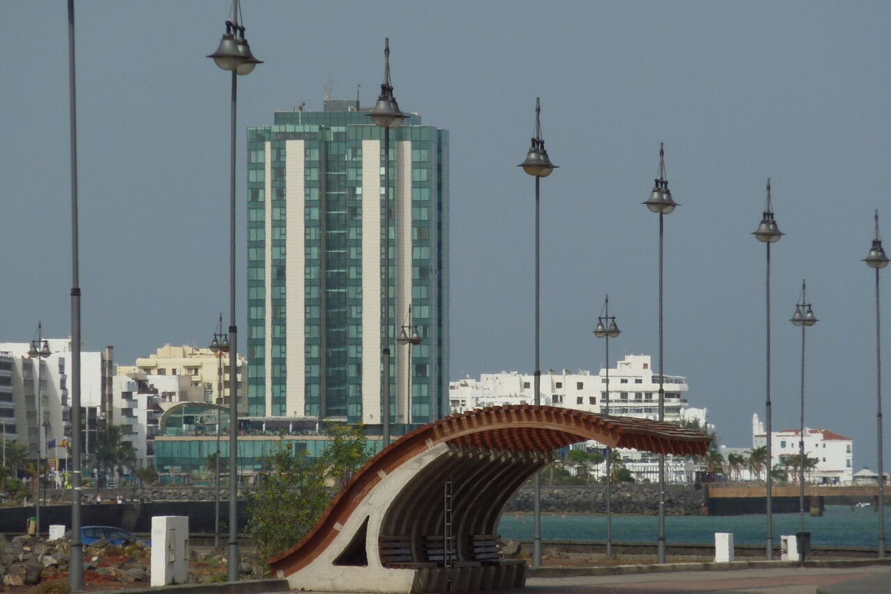 Wir nähern uns in großen Schritten unserem (05) Ziel (16 m). Das einzige Hochhaus der Insel, das Vier-Sterne-Hotel Gran Hotel Arrecife, ist nun zum Greifen nahe. César Manrique setzte seine ganze Kraft dafür ein, die karge und ursprüngliche Schönheit Lanzarotes zu bewahren. Eines seiner Ziele war der sanfte Tourismus ohne Bausünden wie Hochhäuser. Als jedoch César Manrique für einige Zeit in New York studierte, wurde 1960 heimlich und in aller Schnelle das luxuriöse Gran Hotel im Herzen von Arrecife erbaut. Tja - da stand es nun! Der weitere Weg führt vorbei am großen Marktplatz - Markt ist jeden Samstag von 9:00 bis 14:00 Uhr - bis zum grün bepflanzten Park Tematico de Arrecife mit seinen Skulpturen und einem Kinderspielplatz. In dem Dreieck zwischen dem Park, dem gelben Gebäude - dem Sitz der Inselregierung - und dem großen Kreisverkehr befindet sich der nicht zu übersehende zentrale Busbahnhof von Arrecife.