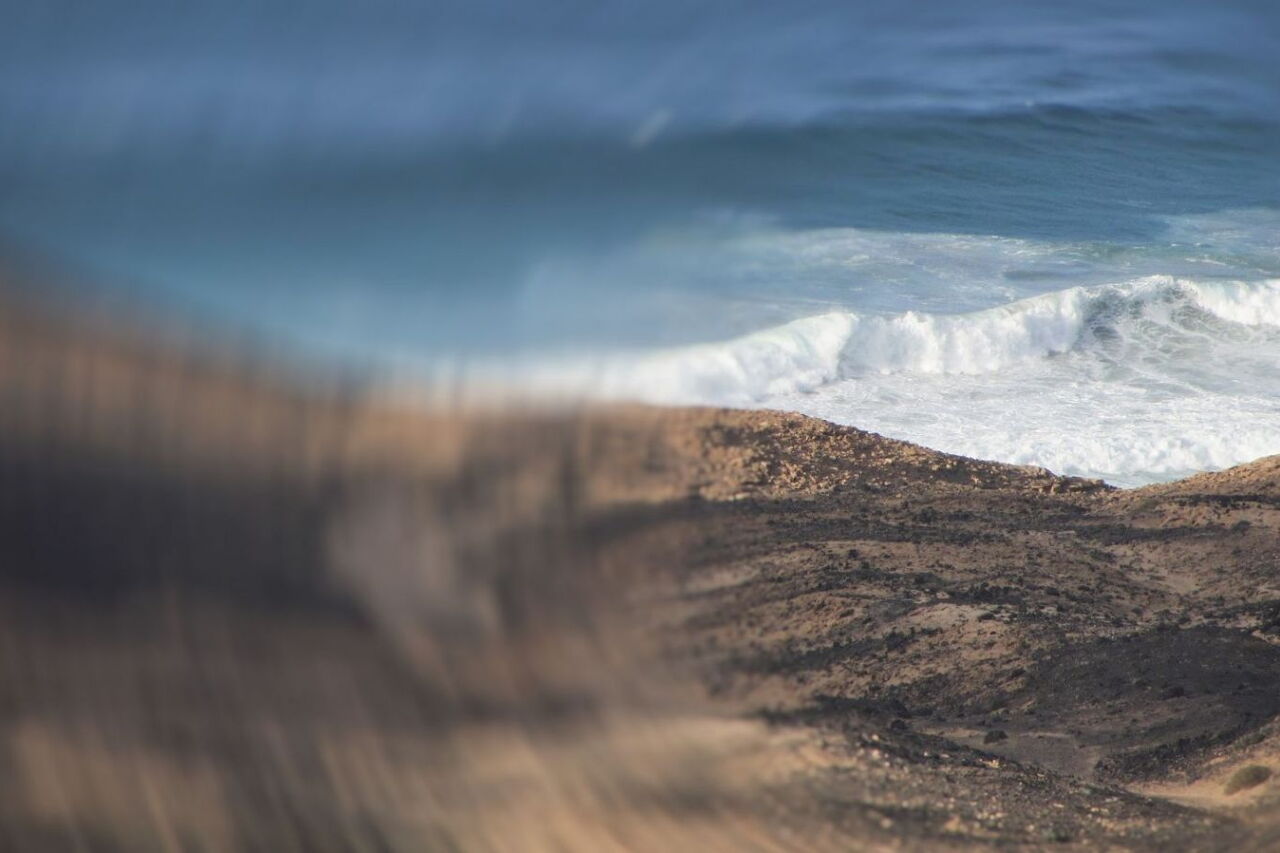 Mittig auf dem sandigen Bergrücken – zwischen zwei großen Barrancos – geht es weitere 550 m seicht bergab. Wir treffen auf den Ursprung eines kleinen Barrancos, dem wir nun ca. 200 m folgen, bis wir am oberen Rand eines Wasserfalls angekommen sind. In einem halbrunden Kreis gehen wir um diesen Wasserfall rechts herum, bis wir auf ein kleines Steinmännchen treffen und nun 50 m in das Trockenflussbett heruntersteigen. Auf Platten aus losem Sandgestein ist der Abstieg rutschig. Auf dem Weg zum Strand wird noch ein kleiner Wasserfall rechts umlaufen, bevor wir den (05) Playa de Barlovento (10 m) erreicht haben. Der wildromantische Strand lädt zum Verweilen und Genießen ein. Wir gehen auf dem gleichen Weg wieder zurück.
