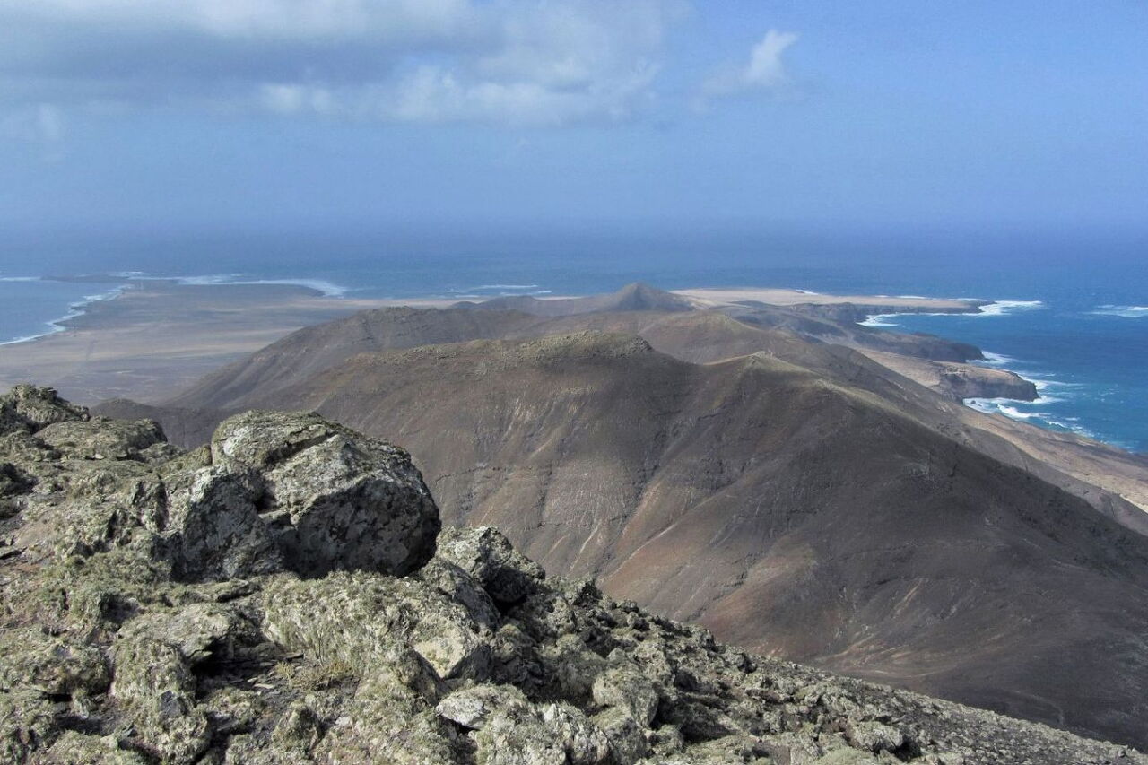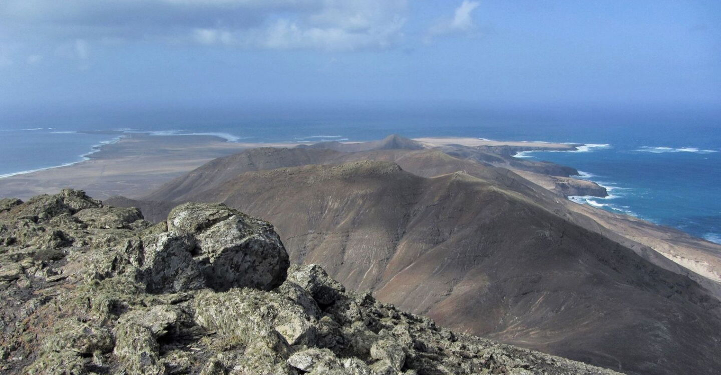 Im oberen Bereich treffen wir auf einige Felsstufen, die wir umlaufen müssen, um den Gipfel des (03) Pico las Pilas (470 m) zu erreichen. Vom Gipfel ergibt sich eine atemberaubende 360°-Rundsicht. Richtung Westen blickt man über den Südzipfel des Eilands, während man Richtung Osten direkt in die steile Flanke des Jandia-Bergmassivs hineinschaut. Der 14 km lange Sandstrand rundet das Naturschauspiel ab.