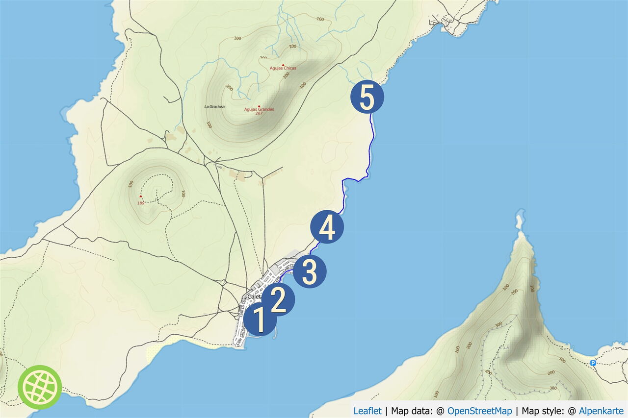 Schöne Wanderung entlang der einsamen Ostküste von La Graciosa. Art des Weges: Der Weg führt über sandigen Untergrund mit einigen felsigen Stellen. Als Ausrüstung empfehlen wir Sonnenhut, Sonnencreme, Essen und Trinken. Einkehr: Es gibt keine Einkehrmöglichkeiten auf der Wanderung, aber dafür einige an der Hafenmole. Diese Tour kann man das ganze Jahr über machen. Wer nicht wandern möchte, kann mit dem Pkw auf einer Schotterpiste bis fast an den Strand fahren. GPS: N29 13.500 W13 27.801, GPS: 29.216483 -13.442233.