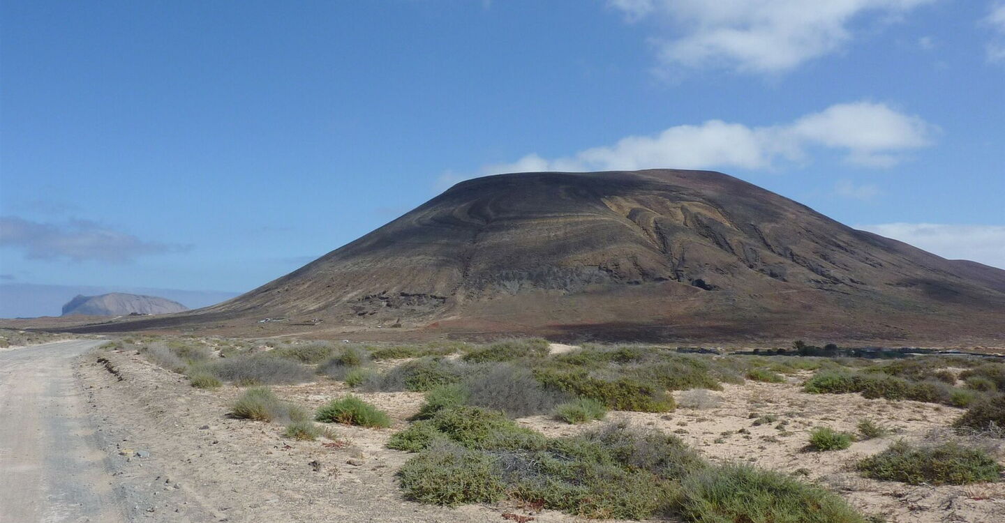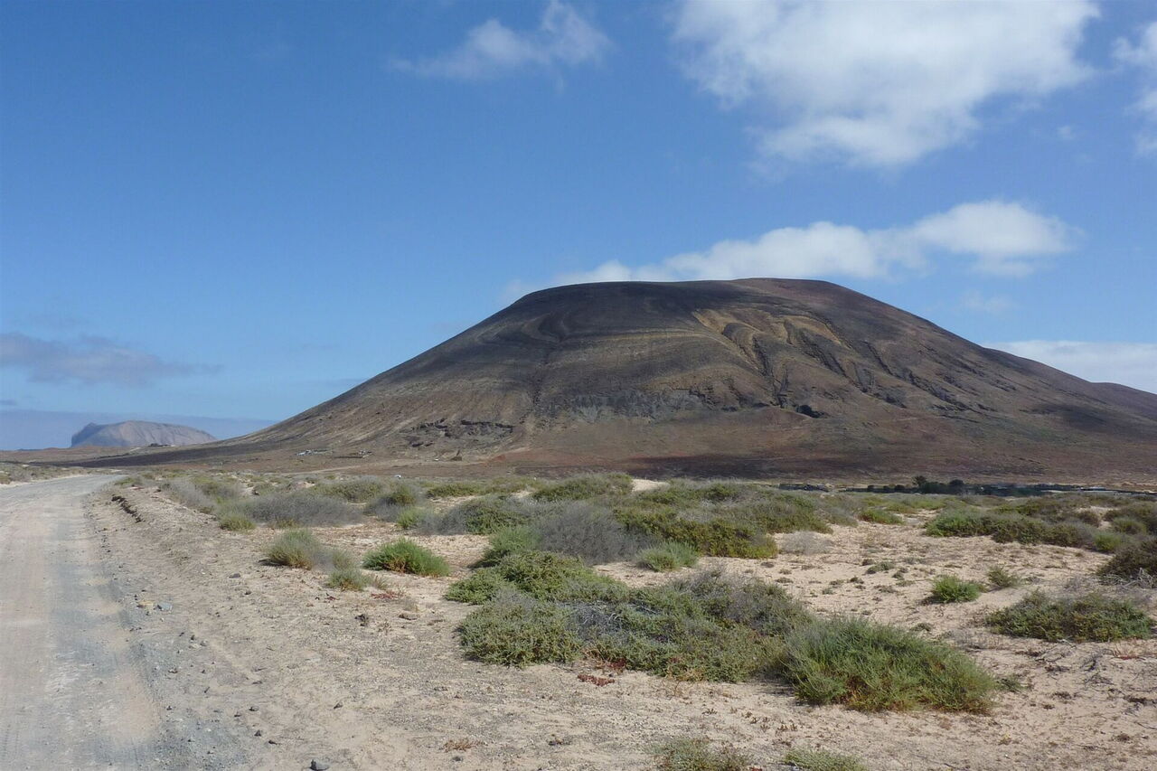 Wir gehen jetzt genau auf die Einzelsattelung der beiden vor uns liegenden Vulkane zu. Bei dem linken Vulkan handelt es sich um die Montaña del Mojon und der rechte Gipfel ist der Agujas Grandes, mit 266 m die höchste Erhebung auf der Insel. Nach insgesamt 2 km Wegstrecke (vom Hafen gemessen) erreichen wir eine 03 Kreuzung im Nichts 62 m. Die Sandpiste rechter Hand führt zu dem kleinen Fischerdörfchen Pedro Barba und halb links führt die Piste zur Punta del Pobre im Süden der Insel.