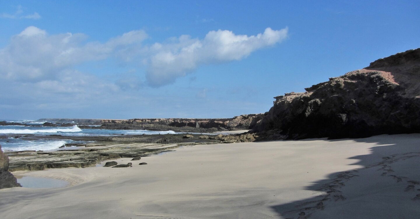 Der sehr wenig besuchte, 250 m lange und bis zu 10 m breite feine Sandstrand liegt versteckt im äußersten Südwesten von Fuerteventura, in der Nähe des Örtchens Puerto de la Cruz. ǀ Der Strand ist nach einer schwierigen Autofahrt auf einer kurzen Wanderung zu erreichen. ǀ Baden ist aufgrund der hohen Wellen nur bedingt möglich. ǀ Verschiedenes: sehr romantischer, sauberer Strand mit sauberem Wasser, teilweise Schatten, nicht mit dem Buggy erreichbar, FKK möglich, Hunde nicht erlaubt ǀ Toiletten, Duschen, Sonnenstühle und Sonnenschirme sind nicht vorhanden ǀ Aktivitäten: die Seele baumeln lassen, Boccia ǀ Tipp: Bei starken Winden, die es auf Fuerteventura oft gibt, liegt man am Playa de Ojas unterhalb der Felsen sehr windgeschützt! |