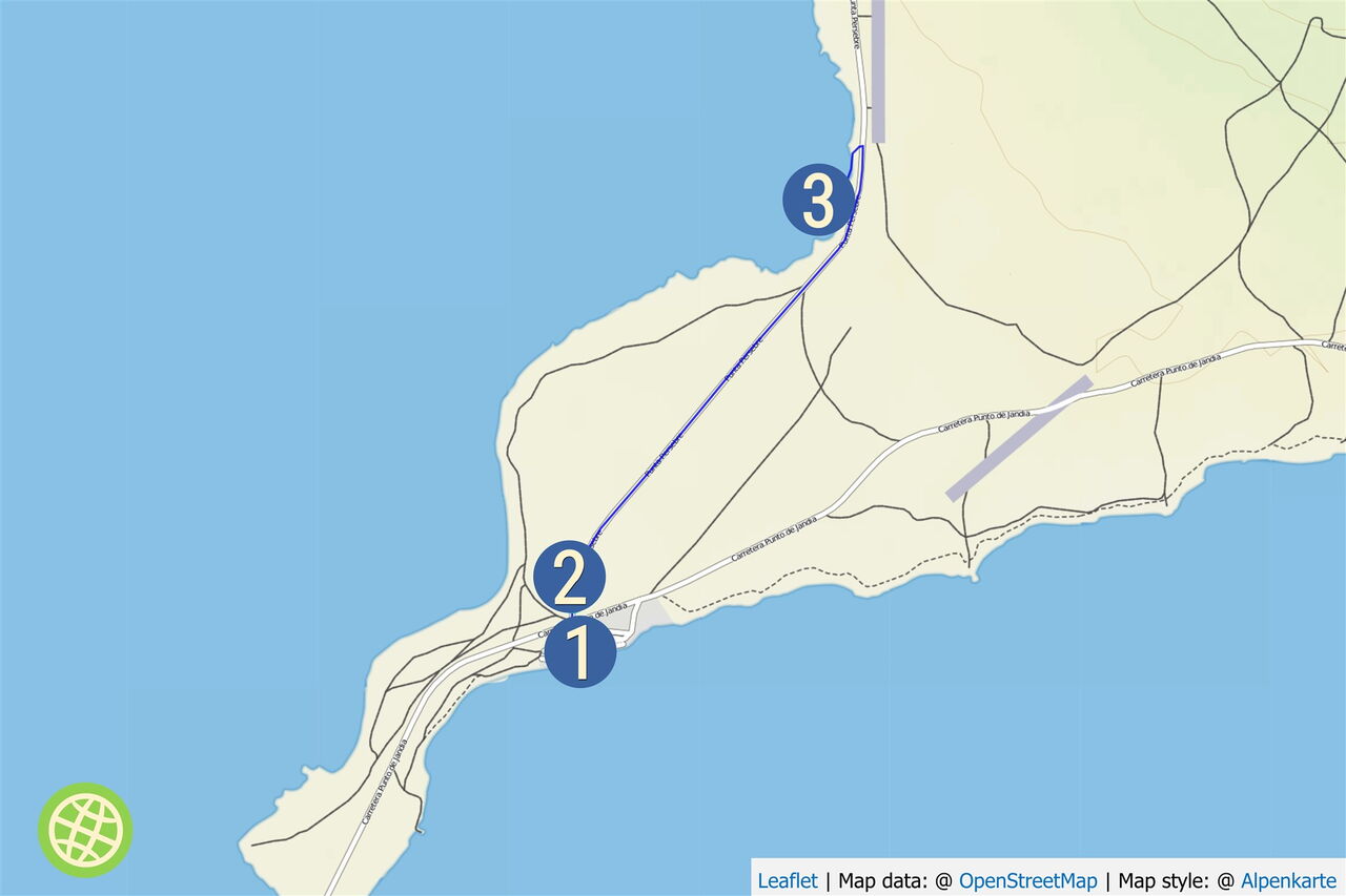 Anspruchsvolle und holprige Anfahrt zum Ausgangspunkt der Wanderung, besonders nach Regen! Fahrzeit ca. 60 min ab Morro Jable. Art des Weges: Anfahrt und Wanderung auf einem Schotterweg. Das Auto sollte vollgetankt sein! Eine klare Empfehlung ist die Bar Tenderete in Puerto de la Cruz, denn dort gibt es die beste Fischsuppe auf der Insel. Diese Tour kann man das ganze Jahr über machen. Interessantes: Das Museum im Leuchtturm ganz im Süden von Fuerteventura.