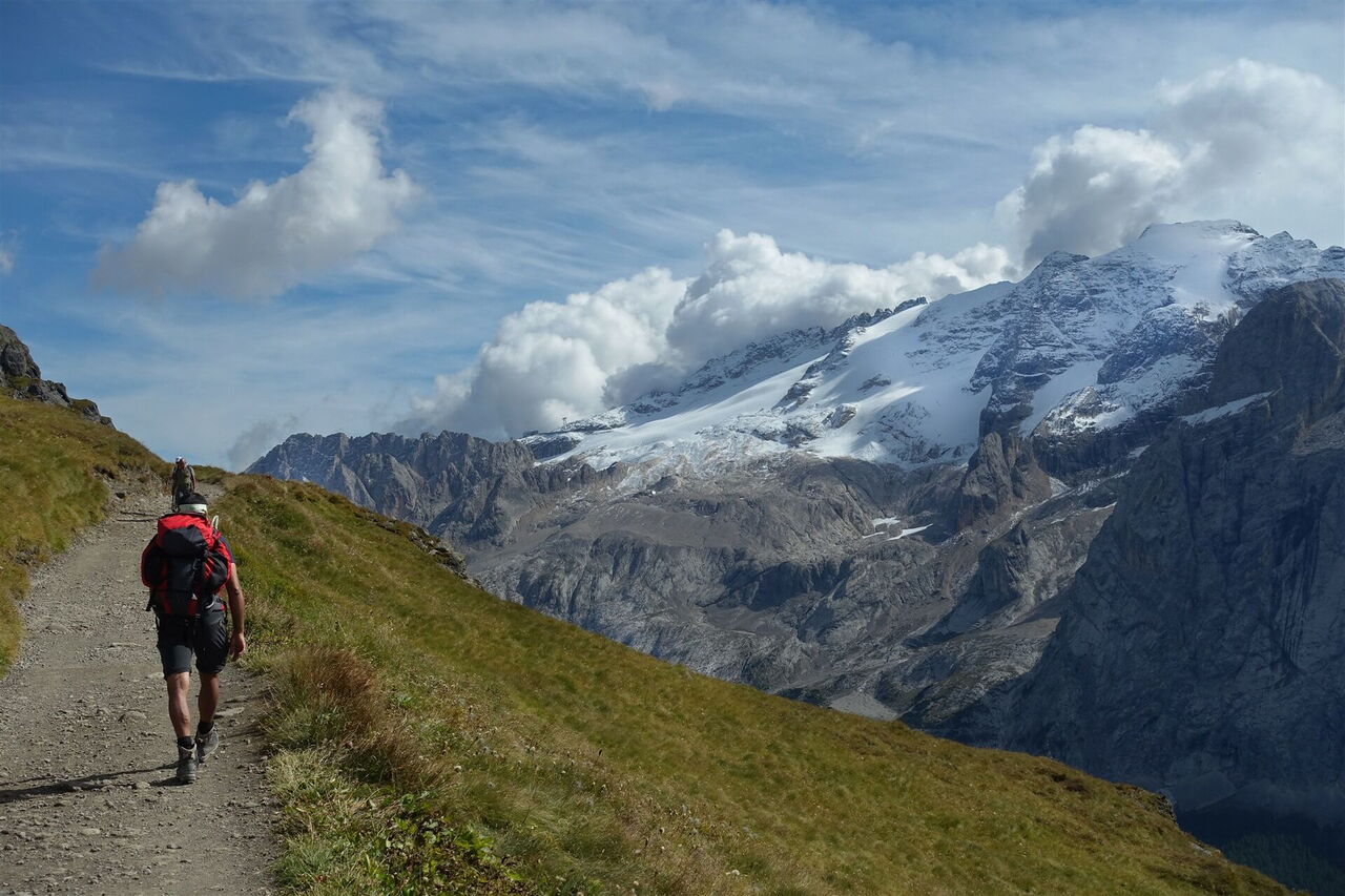 Heute heißt es entspannen und die prachtvolle Aussicht auf die Marmolata genießen. Wir wandern auf dem sogenannten Bindelweg vom Pordoijoch zum Lago Fedaia. Dieser war schon in der Vergangenheit ein wichtiger Verbindungsweg und wurde von Mehlhändlern aus der Provinz Belluno genutzt. Dadurch war es möglich, regen Handel zu betreiben. Mehl wurde gegen handgefertigte Produkte aus der Provinz Trentino getauscht. Auch erhielt die Hütte am Wegpunkt 03 den Namen Weg des Brotes, d. h. übersetzt ins Italienische Viel dal Pan. Wiederentdeckt wurde der Weg von dem Deutschen Dr. Karl Bindel, deswegen heißt er auch Bindelweg.