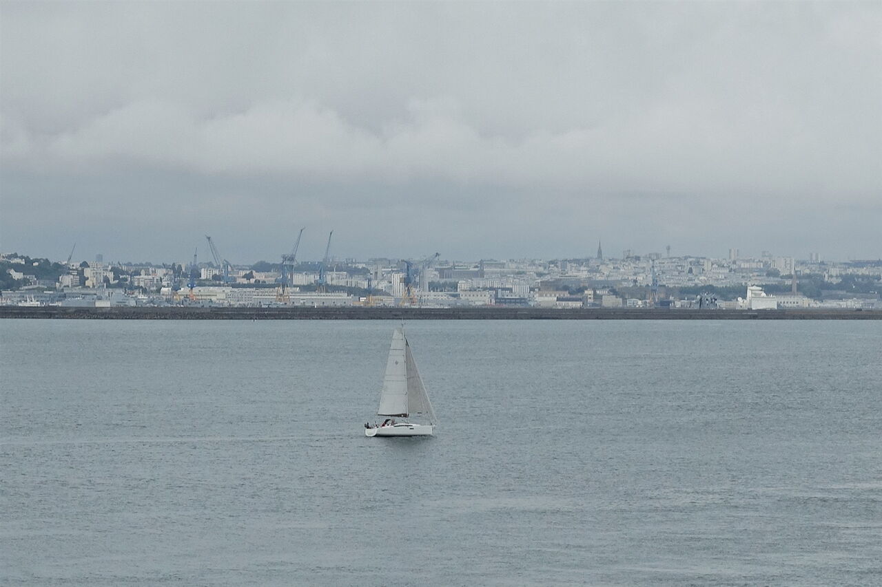 Wir setzen unsere Wanderung fort. Bei der nachfolgenden Weggabelung gehen wir halb links durch den Verteidigungswall hindurch und im weiteren Verlauf bewegen wir uns mittig zwischen zwei Verteidigungslinien. Kurz darauf gehen wir links und sofort wieder rechts. Bei einer Kreuzung mehrerer Pfade gehen wir geradeaus weiter. Es folgt ein zugewachsener Pfad, Brennnesseln erschweren das Vorankommen. Wir gehen unter einer kleinen Brücke hindurch und am Parkplatz links, um hinter einem kleinen Bunkerhaus über den Treppenpfad zum 03 Fort de Cornouaille (22 m) abzusteigen – eine Artillerie-Verteidigungslinie aus den 17. Jahrhundert, die den Seezugang nach Brest kontrollierte. Ihre Position wurde bewusst so gewählt, dass sie einfahrende Schiffe einem gewaltigen Kreuzfeuer aussetzen konnte. Bei einem riesigen betonierten Rechteck – keine Ahnung, was das sein soll, hier befindet sich auch ein Aussichtspunkt – gehen wir rechts. Wir kommen an der unterhalb am Ufer liegenden Torpedobatterie vorbei und können bereits den Hafen von Brest auf der anderen Uferseite ausmachen.