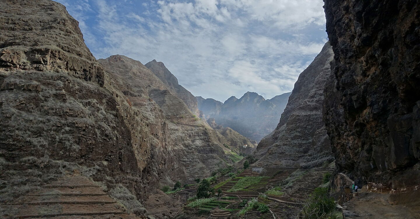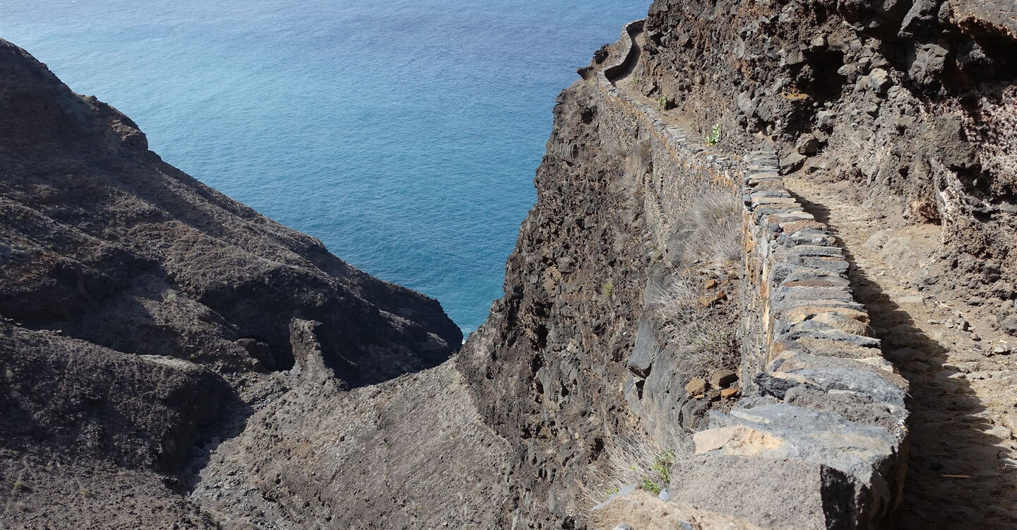 Von der grünen Oase des Ribeira da Cruz laufen wir auf landschaftlich wunderschönen und unentdeckten Pfaden entlang der Küste. Dabei queren wir die Schluchten des Ribeira do Alto Mira und Ribeira dos Paus. Beim Schluchtauslauf des wahrhaft gewaltigen Ribeira do Figueiras gehen wir landeinwärts, bis zum Dorf Figueiras. In der einzigen Unterkunft wird man sehr gastfreundlich empfangen. Ab hier beginnt eine Zeitreise in die Vergangenheit, die gleichzeitig das Heute prägt. Das Dorf ist nur über Caminhos zu erreichen, keine Straße, keine Piste! Noch heute übernehmen Esel den Transport aller Waren. Besonders auffällig ist der durchdringende Laut der wiehernden Esel. Der in der Lautstärke an- und abschwellende Ton hallt als Echo von den Bergwänden. Da kann schon mal die Fantasie mit einem durchbrennen! Denn exakt diese Tonlage ist der Fanfare der angreifenden Orks – aus dem Film der Herr der Ringe – unverwechselbar ähnlich. Ein Abenteuer und eine Begegnung der besonderen Art.