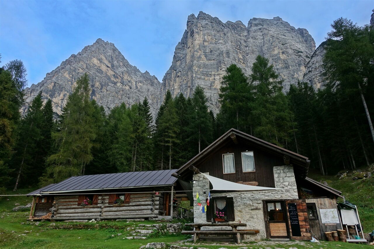 Wir gehen in nordöstlicher Richtung um das 01 Rifugio Bosconero (1.457 m) herum, um dann in östlicher Richtung auf dem Wanderweg 490 durch den Wald aufzusteigen. Bereits im Reich der Latschenkiefern angekommen gabelt sich der Pfad. Beide Wege sind zielführend und verlaufen unterhalb der extrem steil aufragenden Nordwand des 2.404 m hohen Rocchetta Alta. Kurz vor der Scharte führen beide Pfadspuren wieder zusammen. Dort quert auch der Wanderweg 482 und wir beginnen mit dem steilen Aufstieg durch ein nicht enden wollendes Geröllfeld.