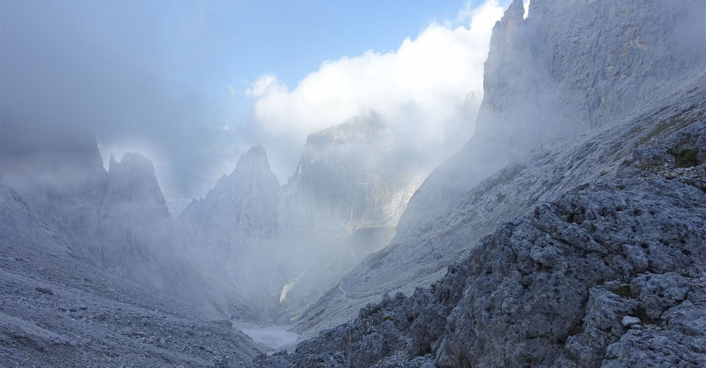 Hinter diesem leichten Klettersteig folgt noch einmal ein steiler Aufstieg zum 04 Passo di Ball (2.443 m). Rechts vom Pass erhebt sich der 2.744 m hohe und turmartige Felsgipfel Campanile Pradidali. Links vom Pass befindet sich die 2.731 m hohe Cima Pradidali. Wir übersteigen den Pass und folgen weiterhin dem Wanderweg 715, nun durch eine kesselförmige Eintiefung. Bei guter Sicht kann man dann bereits das Rifugio Pradidali ausmachen, umgeben von den wohl schönsten Bergspitzen der Pale di San Martino.
