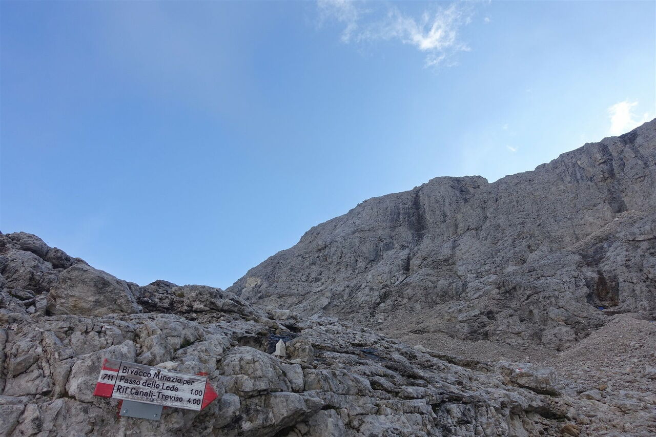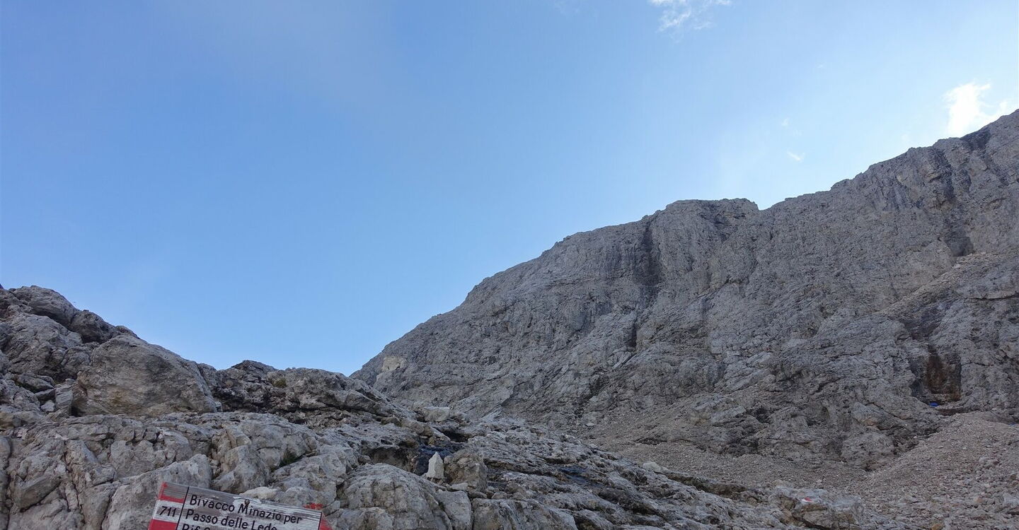 Da kaum noch ein Pfad zu erkennen ist, helfen rot-weiße Markierungen und Steinmännchen bei der Orientierung: Es folgt ein leichter Klettersteig. Wer sich unsicher im Fels fühlt, sollte an dieser Stelle das Klettersteigset anlegen. Danach gelangen wir zu einem kleinen Plateau mit zwei in den Fels geschlagenen Metalltritten. Der weitere Aufstieg bleibt anspruchsvoll, teilweise müssen die Hände zu Hilfe genommen werden. Wir erreichen schließlich einen gigantischen Aussichtspunkt, den 2.695 m hohen Passo delle Lede. Durch eine schmale Rinne steigen wir dann in das ursprüngliche Valón de le Léde ab. Rechts von uns erheben sich imposant die 2.774 m hohe Cima Wilma und die 2.900 m hohe Cima Canali. Noch heute kann man auf dem Wegstück bis zum Bivacco die verbliebenen Wrackteile eines Flugzeugabsturzes entdecken. Am 19. Juli 1957 stürzte in 2.650 m Höhe eine Lockheed P-2V6 Neptune der U.S. Navy an der Südwand der 2.993 m hohen Cima La Fradusta ab. Auf diesem Höhenweg durch eine einmalige Dolomitenlandschaft erreichen wir dann das 03 Bivacco Carlo Minazio (2.294 m).