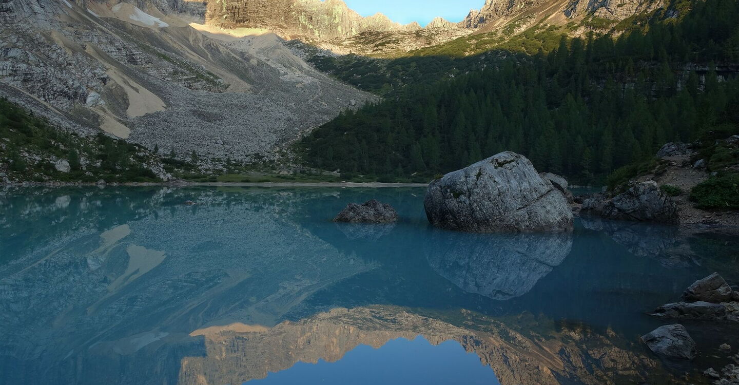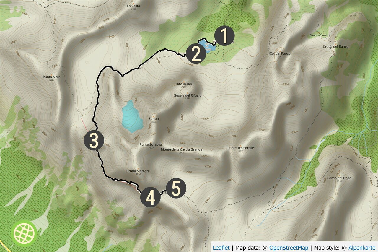 Bereits nach wenigen Minuten erreichen wir den 02 Lago del Sorapiss (1.894 m). Da Fotos vom Lago del Sorapiss bei Instagram sehr viele Likes bekommen haben, ist er im Ranking sehr weit oben. Die Folge: Das Rifugio Vandelli verkauft täglich bis zu 5.000 Essen und Carabinieri patrouillieren am See, um zu verhindern, dass die Besuchermassen Müll hinterlassen oder gar im eiskalten See ein Bad nehmen. Hinter dem See erhebt sich imposant die 2.603 m hohe Felsnadel Dito di Dio, was ins Deutsche übersetzt heißt "Finger Gottes". Wir gehen an der rechten Seite des Sees entlang, um an dessen Ende auf den Überresten einer Gletschermoräne und im oberen Abschnitt in einer steilen Geröllrinne aufzusteigen. Links oberhalb (in südlicher Richtung) sehen wir die spärlichen Überreste des Sorapissgletschers (Ghiacciaio Occidental). An dieser Stelle gehen wir halb rechts um einen Felssporn herum, um dann über von Gletschern platt geschliffene Felsen in das Hochkar Tonde de Sorapiss abzusteigen.