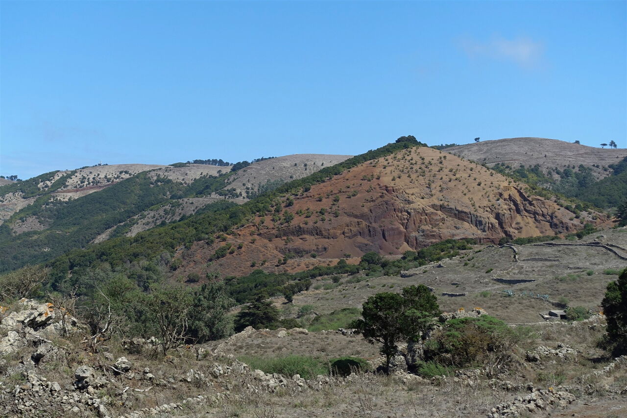 Nach insgesamt 475 m auf dieser Straße – oder 50 m hinter dem Verkehrsschild kurvige Straße – verlassen wir die (03) Straße HI-10 (819 m) nach links und wechseln auf die steil ansteigende Asphaltstraße. 100 m vor einem riesigen Eukalyptusbaum – hier steht halb links ein Wacholderbaum – gehen wir links. Hinter einem rechts liegenden Ziegengatter wird der Weg zum Pfad – im Frühjahr ist er oft stark verwachsen. Es folgt ein diffuses Wegstück. Wir passieren zwei Ziegenzäune und orientieren uns in Richtung der oberhalb liegenden Einsattelung. Bei einem Mauerdurchbruch gehen wir auf einem Trampelpfad rechts an der Mauer entlang. Wir gehen direkt auf eine weitere Mauer zu, um an dieser halb rechts vorbei auf eine etwas erhöht liegende Piste zu gelangen.