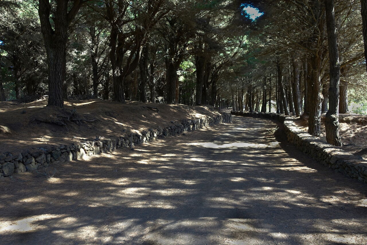 Vom (01) Start und Ziel (985 m) verlassen wir die von San Andres kommende Straße nach halb rechts. Auf der Kiefernallee erreichen wir eine Dreiwegegabelung, an der wir geradeaus weiterwandern. Wir kommen durch einen kleinen Wald, bis dann auf Höhe des rechts von uns liegenden verlassenen Bergdorfes La Albarrada der weitere Weg halb links steil bergauf führt. Nachdem die Asphaltstraße in eine Piste übergegangen ist, erreichen wir eine Anhöhe. Bei guter Sicht erheben sich die Nachbarinseln La Gomera und Teneriffa aus dem Dunst.