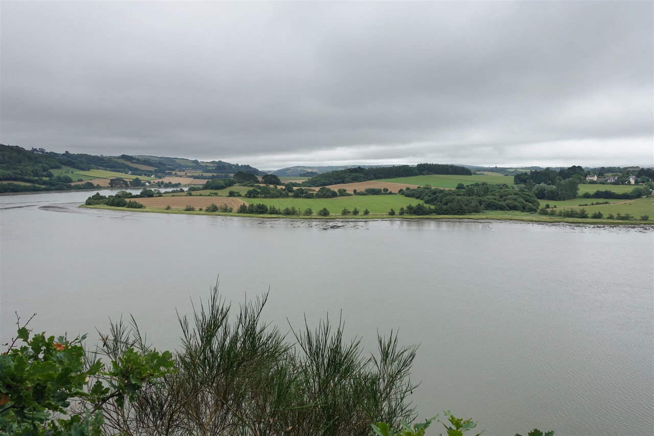 Zum Auftakt der Wanderung erleben wir einen atemberaubenden Blick auf den 140 m tiefer liegenden Fluss Aulne Maritime. Auf der anderen Uferseite liegt das Dorf Trégarvan und dahinter erhebt sich der Vulkanberg Ménez-Hom. Auf der linken Seite, weiter stromaufwärts, befindet sich die Passage de Dinéault, wo bis 1950 eine Fähre verkehrte. Vom 01 Start und Ziel (144 m) gehen wir über den Parkplatz und folgen der Zufahrtsstraße in nördliche Richtung, um hinter dem weißen Gartentor links in die Straße einzubiegen. Die nach links abzweigende Straße ignorieren wir und gehen geradeaus weiter, nun auf der Schotterpiste.